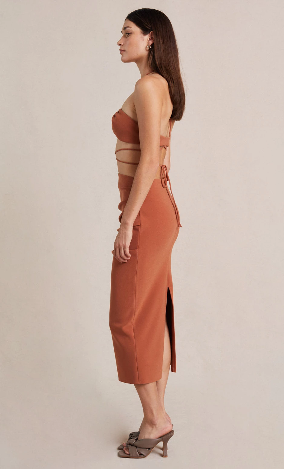 The Alba Midi Skirt is rendered in soft stretch crepe fabric that skims along the gathered high waist and leads to a back centre split hem.