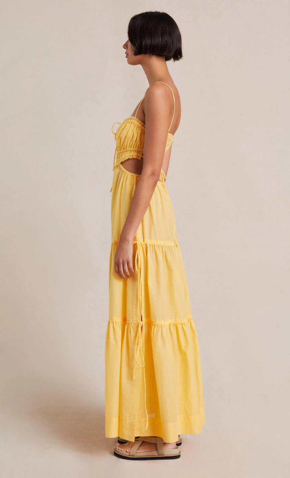 A chic statement style, the Alexandra Tie Maxi Dress is a strappy maxi length dress with a gathered elasticated bodice and waist and side cut out details that wrap around to an open back. The maxi dress is fitted at the bust and high waist before falling into a flowy tiered maxi skirt with adjustable tie details.