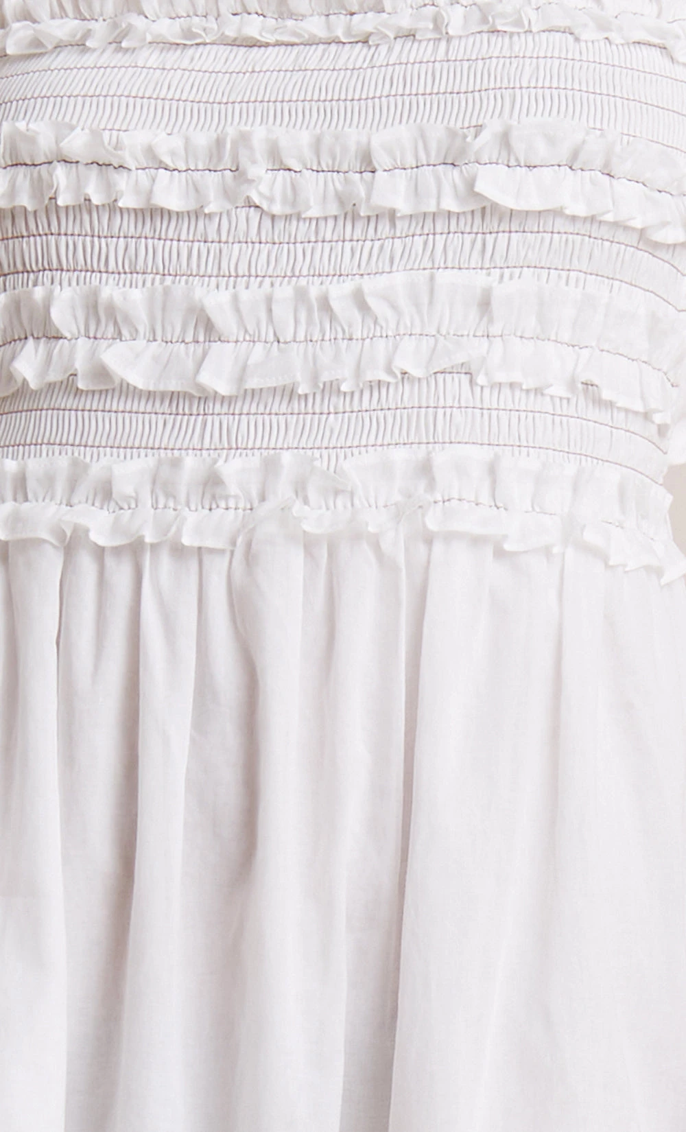 The Alina Midi Dress is an easy-to-wear style cut from a breezy cotton fabric. The dress is shirred all through the bodice with frill detailing and thin rouleau straps, complemented by ties at the back to adjust the fit. It’s finished with a floaty midi length skirt and side pockets.