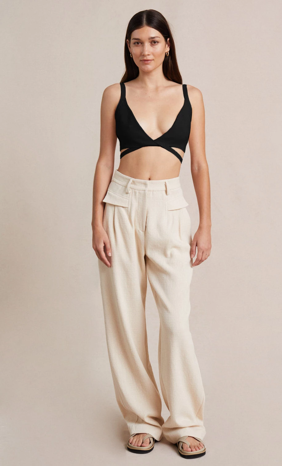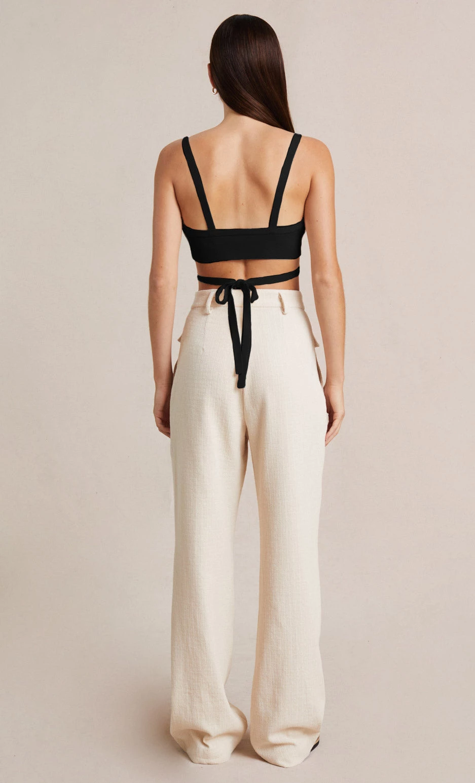 Coordinate your look with the versatile Amalia Knit Twist Top. This statement style is spun from a stretchy knit fabric in a cropped silhouette. The top features a plunging V-neckline with a twist front that leads to a self-tie back. Styled with our Billy Pant.