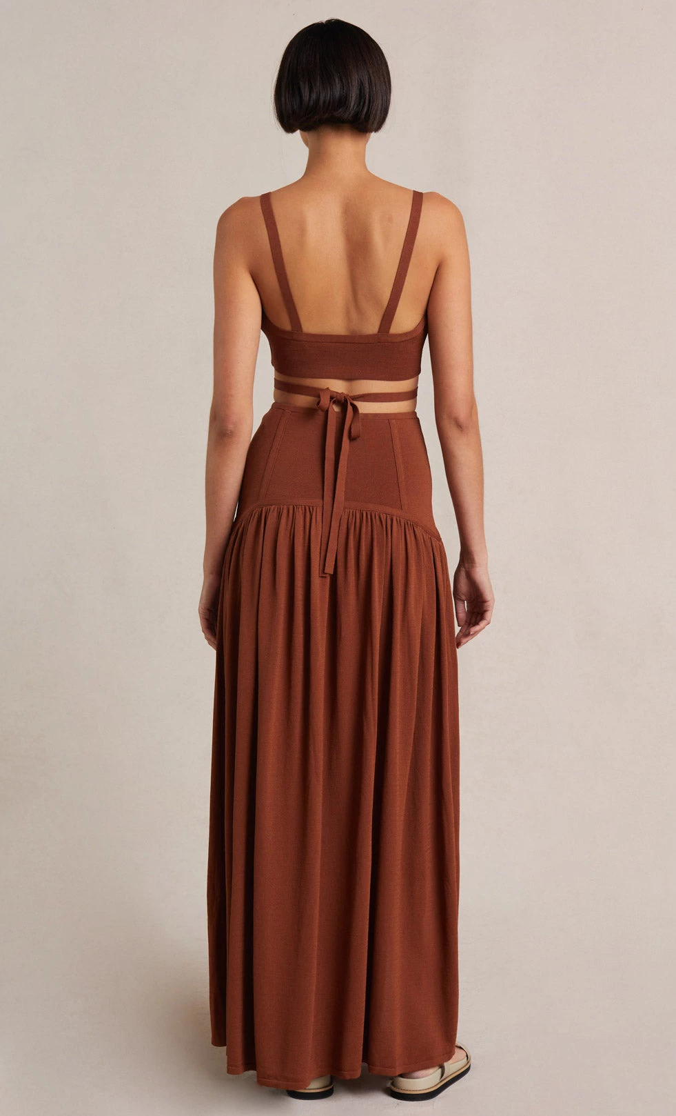 Coordinate your look with the versatile Amalia Knit Twist Top. This statement style is spun from a stretchy knit fabric in a cropped silhouette. The top features a plunging V-neckline with a twist front that leads to a self-tie back. Styled with our Amalia Maxi Skirt.