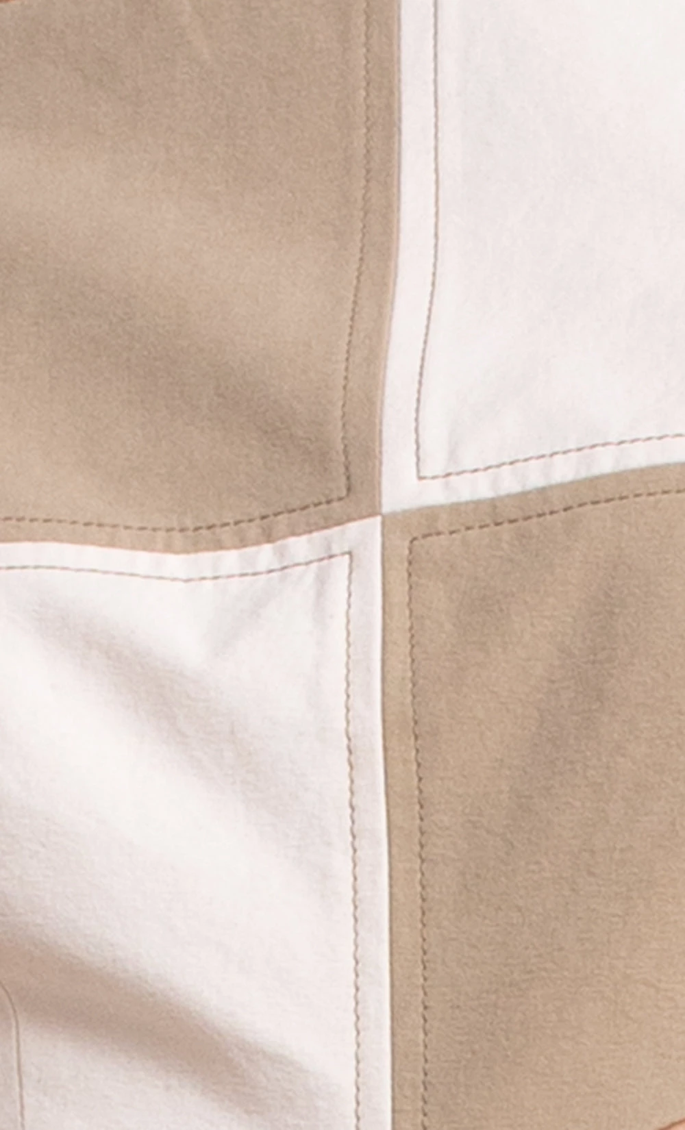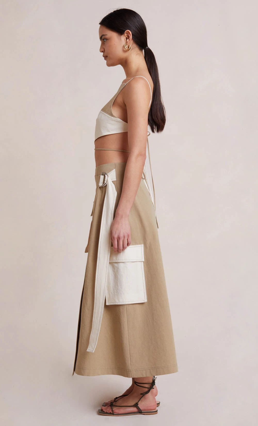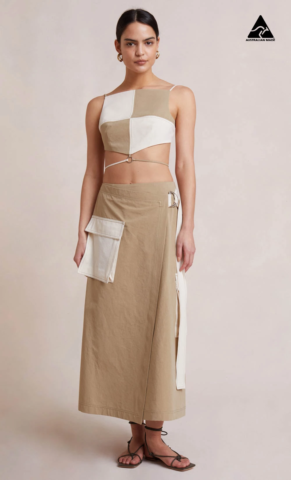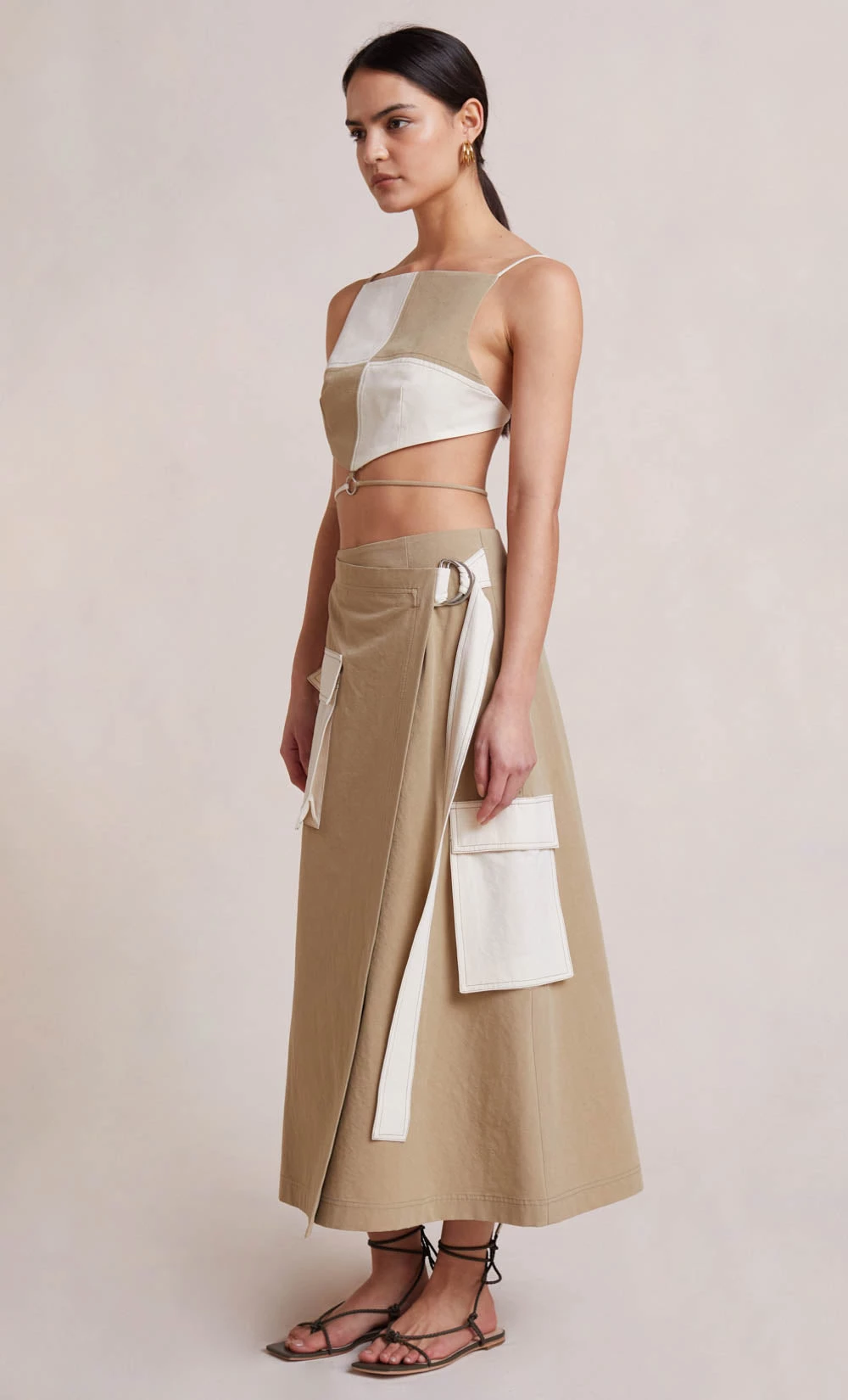 Your favourite new look is just around the block. The Artie Top is a colour-blocked statement style cut from a woven cotton fabric. This cropped top features a high straight neckline with thin rouleau straps that lead to an open back. The silhouette is complemented with a diamond hem accented by a front silver O-ring detail and waist ties.