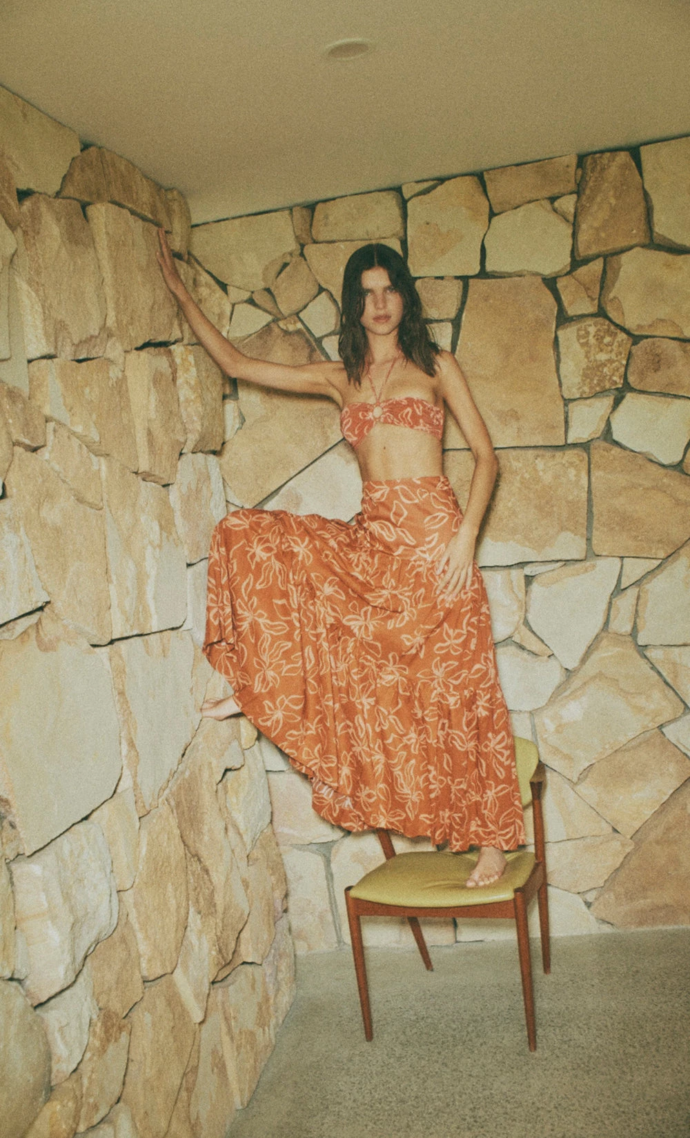 The Aurora Maxi Skirt is a flowy ankle length style cut from a signature floral print cotton fabric. The maxi skirt cinches in at the high waist with drop waist panelling that falls into a gathered skirt. Styled with our matching Aurora Top