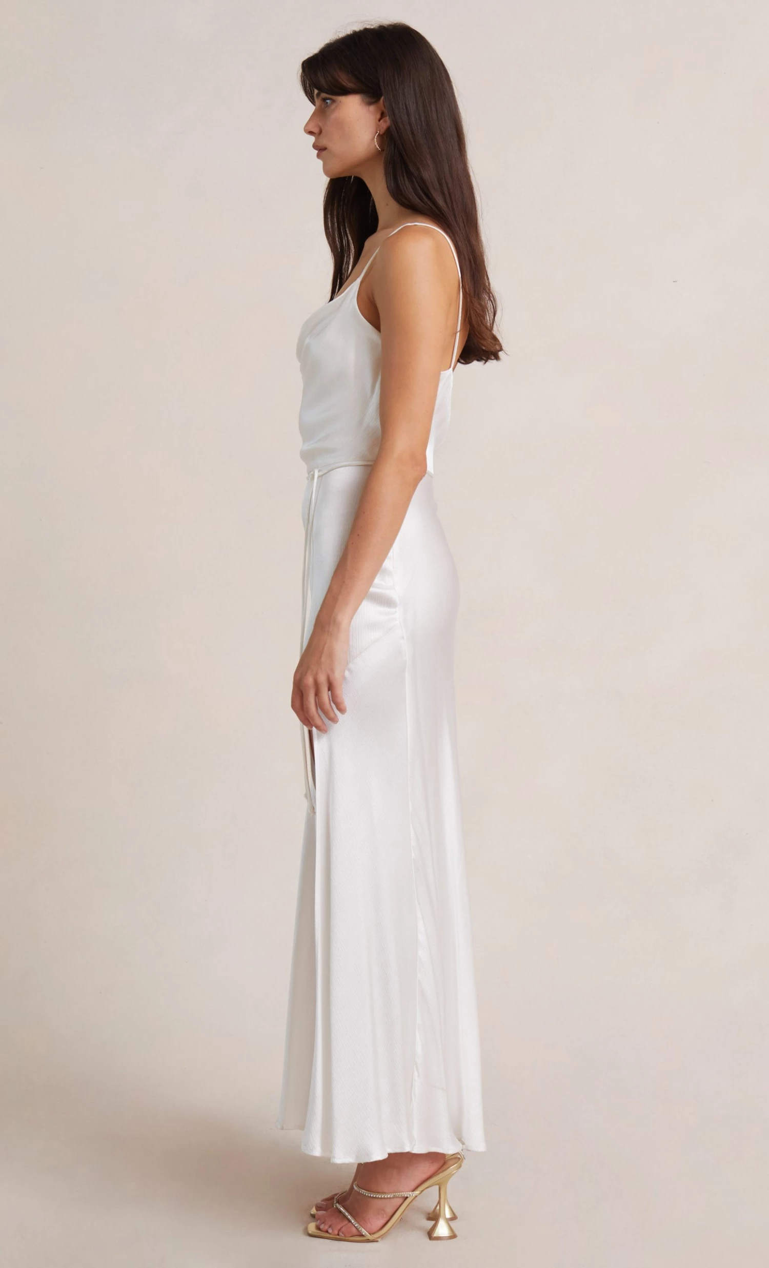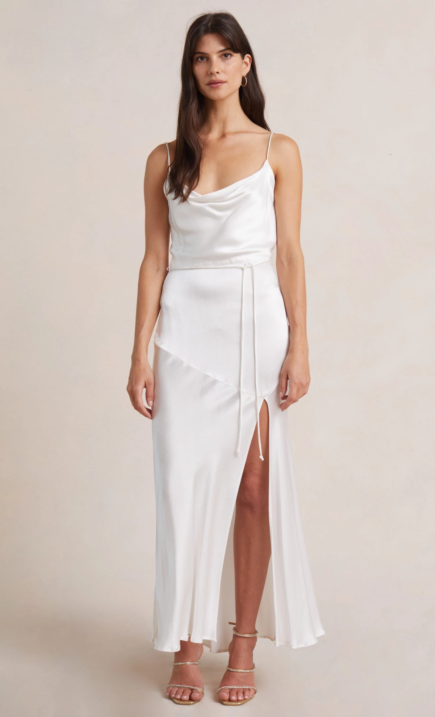 Eternally flattering bias-cut slip dress includes a slight cowl neckline, thin rouleau straps and a tie waist detail. The Moon Dance Midi Dress features a statement front leg split in the skirt.