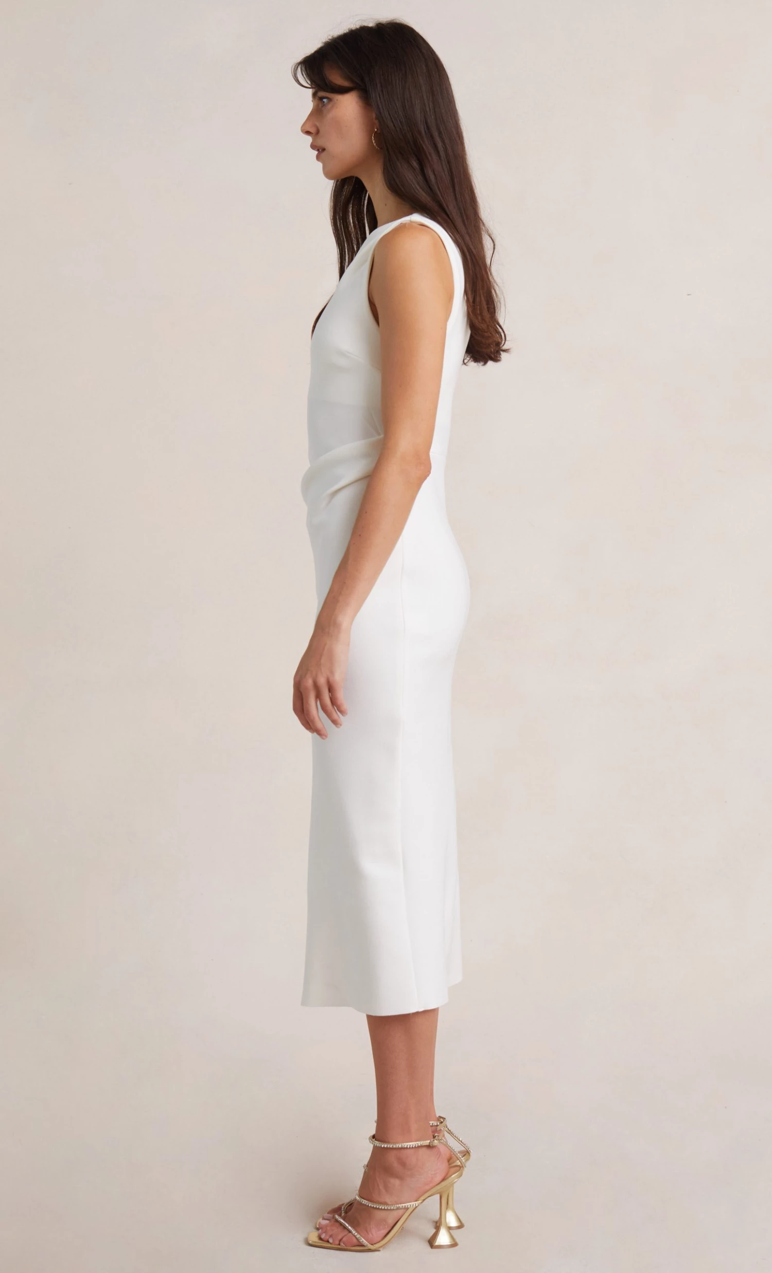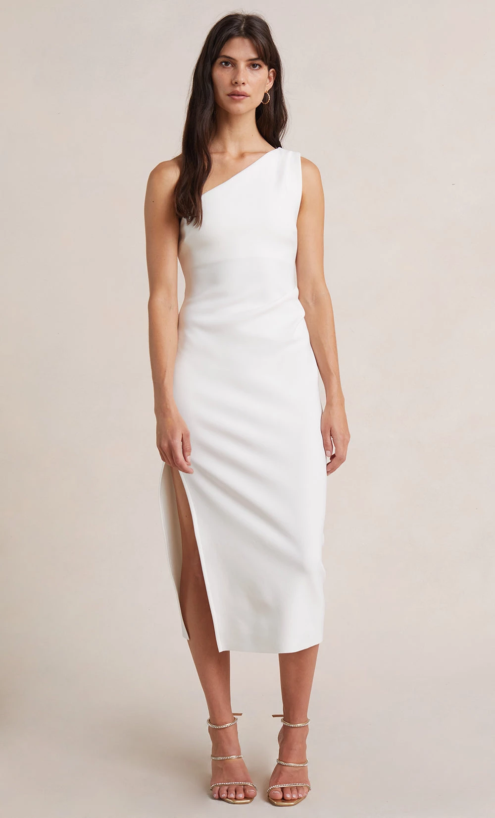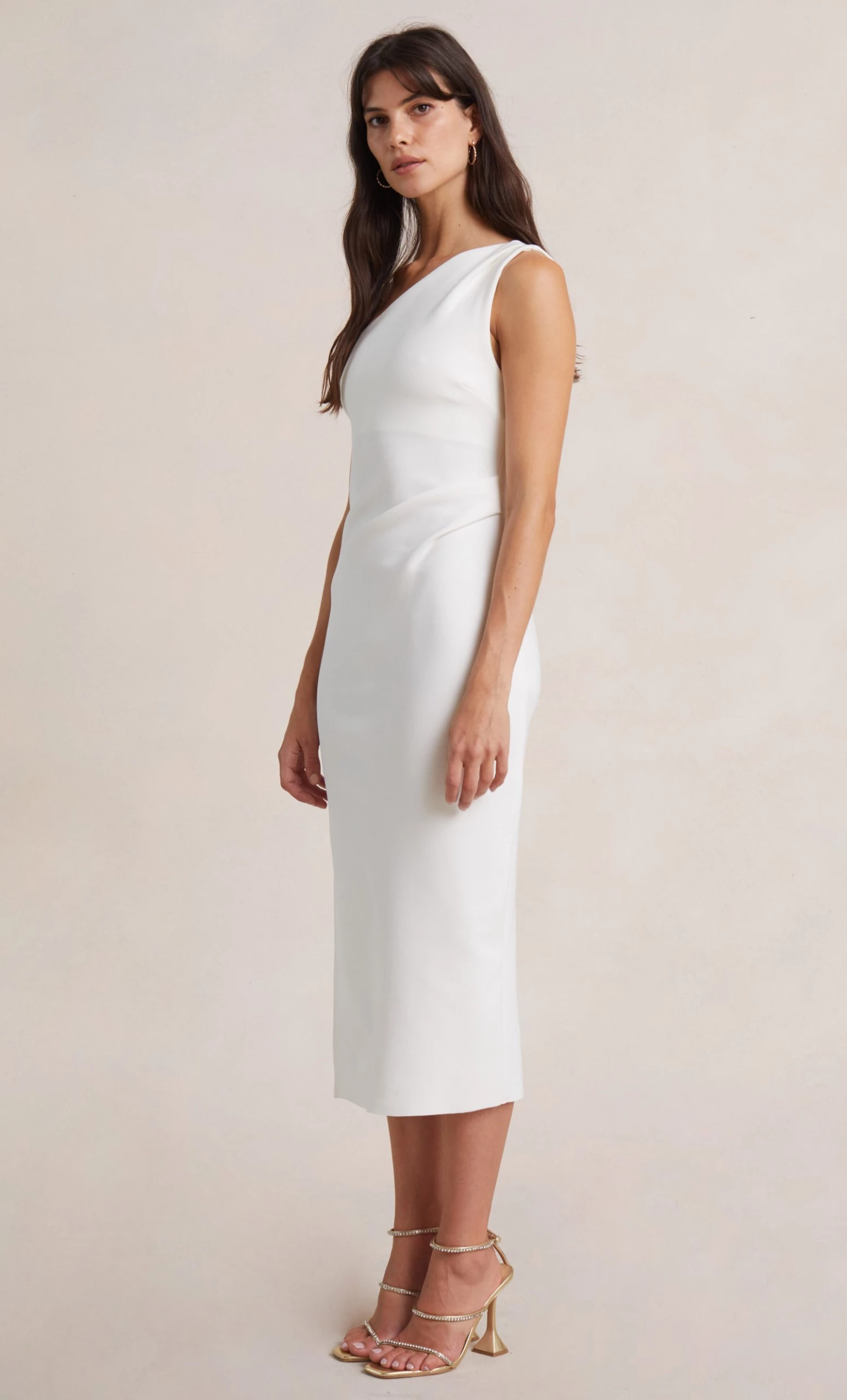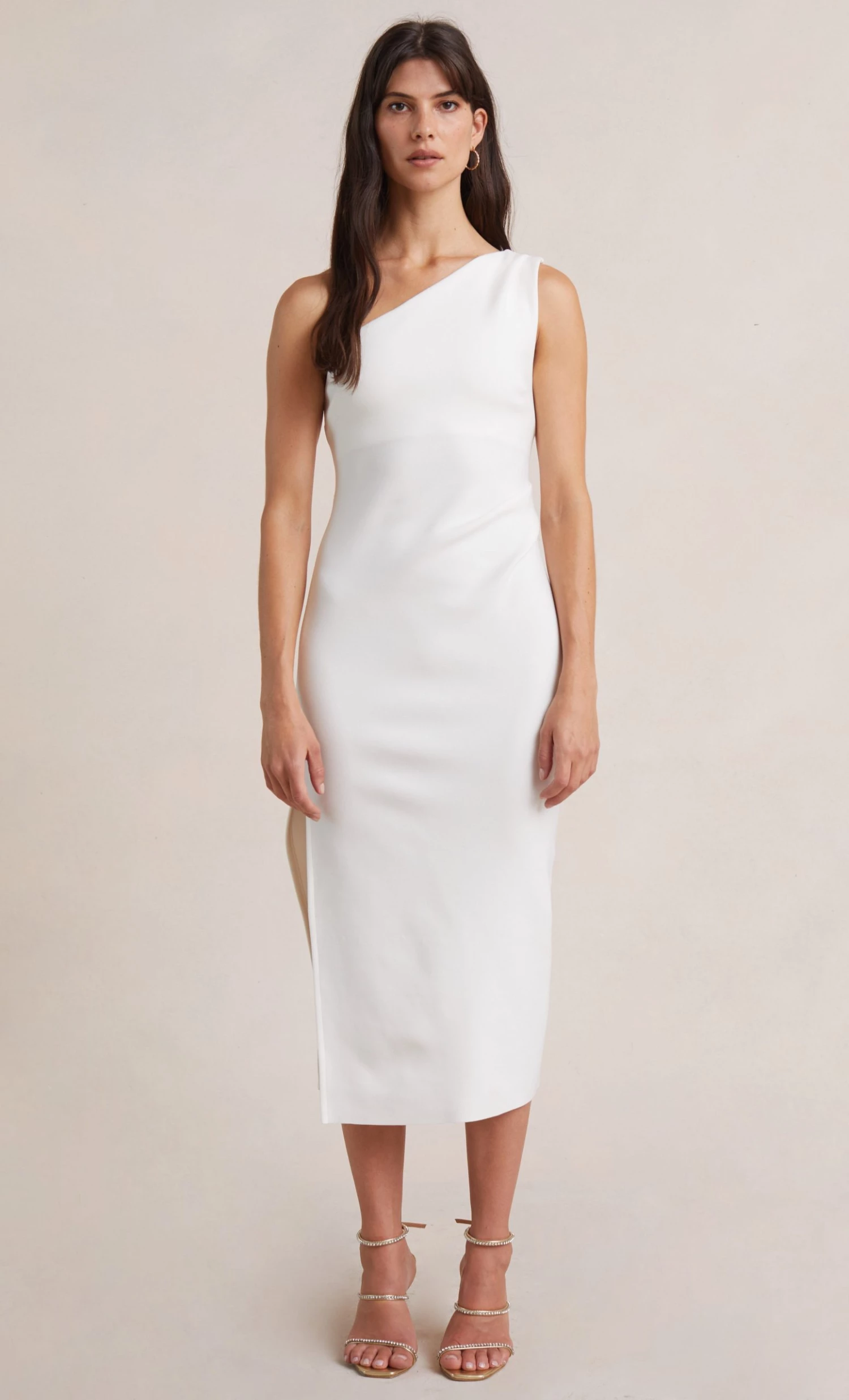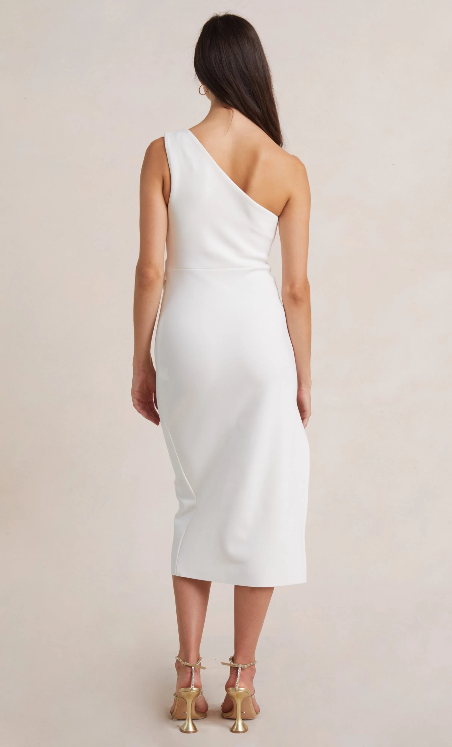 An easy to wear asymmetrical midi dress cut from a stretch bonded crepe fabric that cinches in the body and skims the silhouette. The one shoulder dress features a slight gathering detail at the waist and hips for a more comfortable fit.