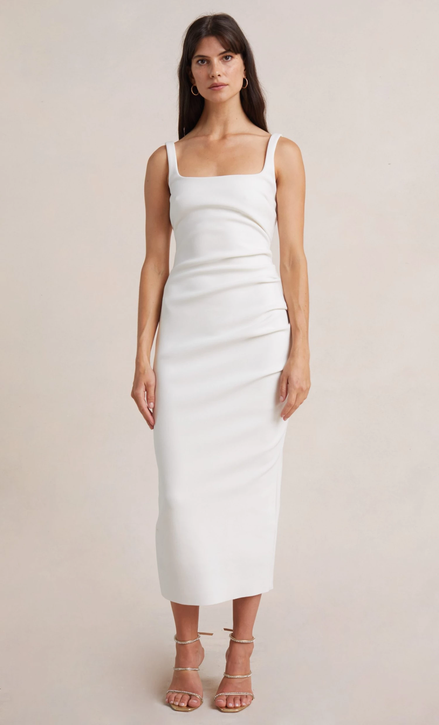 A timeless square neck midi dress with a low scoop back. The stretch bonded crepe fabric and side tuck detailing at the waist and hips of the dress create a very easy to wear and flattering silhouette for all body types.