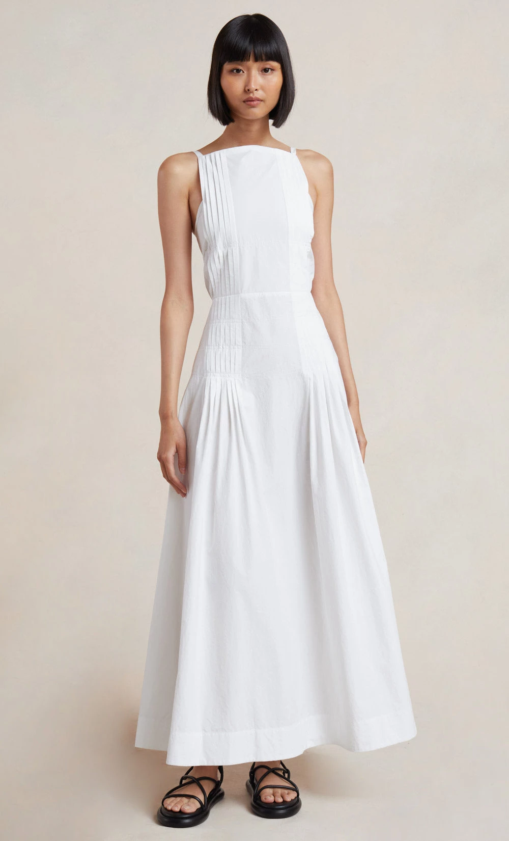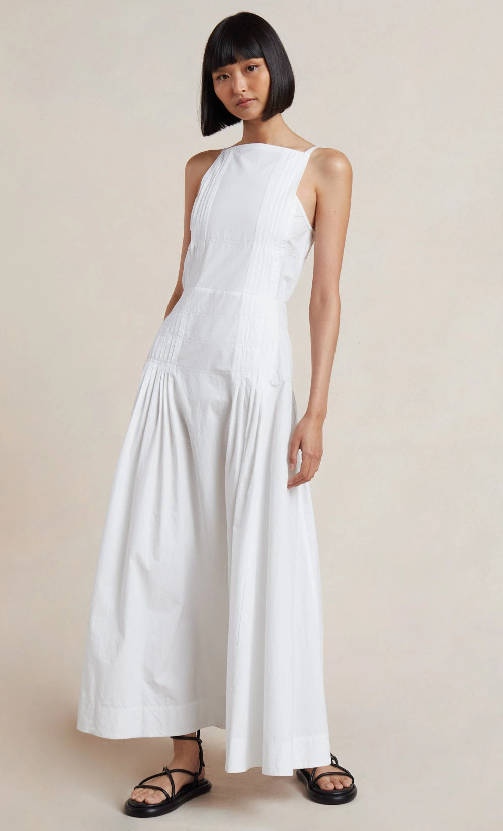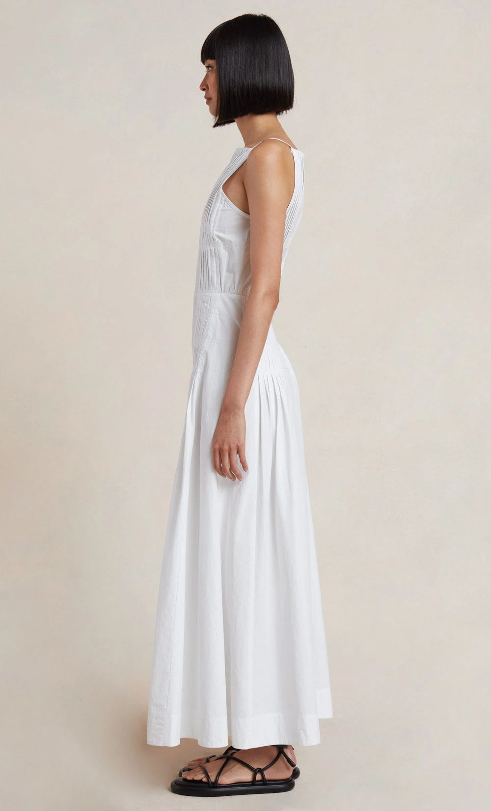 Cut from a lightweight and breezy cotton fabric, the Bobby Maxi Dress is an easy-to-wear style framed in a chic silhouette. The maxi dress has a high straight neckline with a boxy bodice and pintucked details that lead to a dropped waist, falling into a flowy gathered skirt.