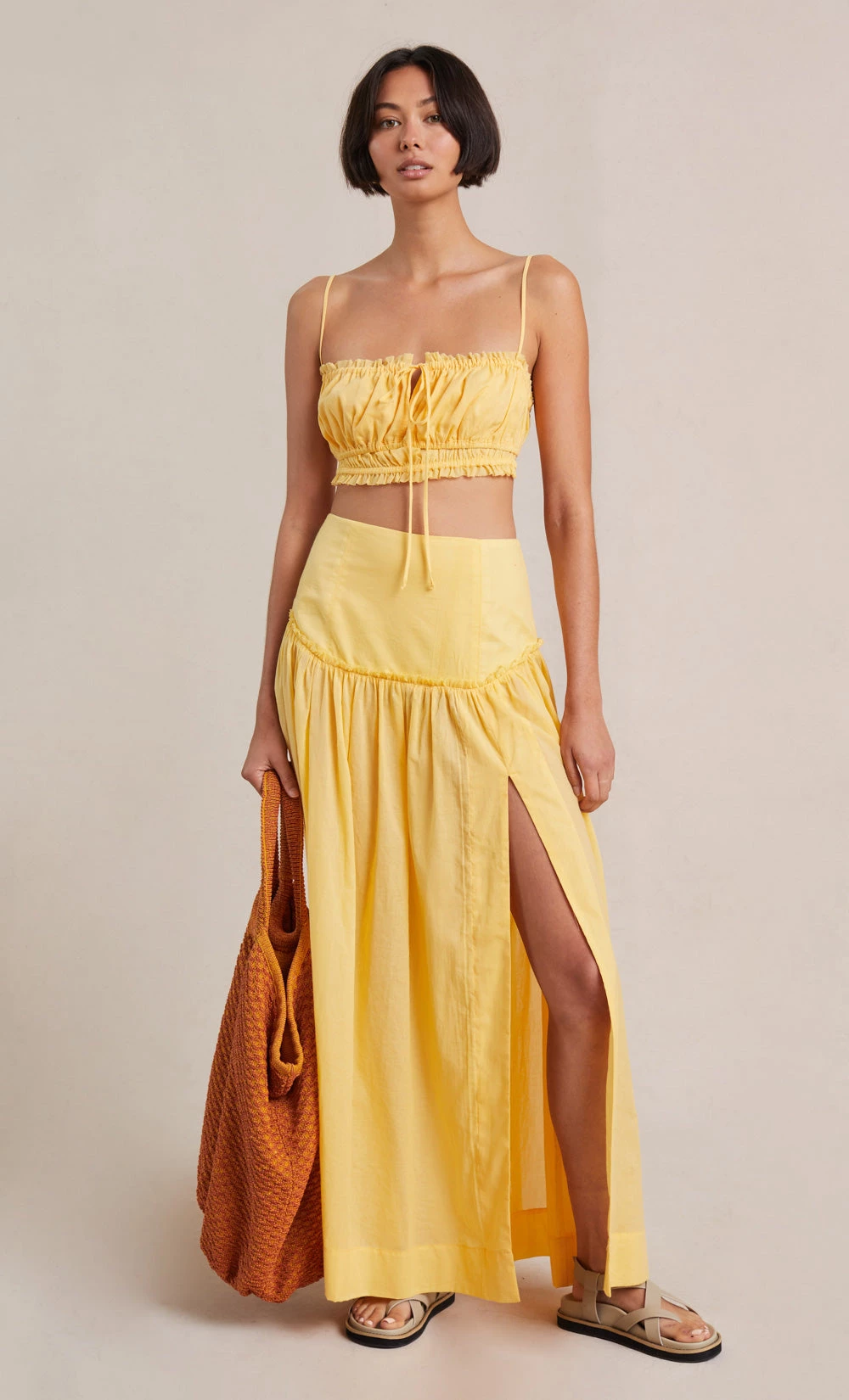 Cut from an easy breezy woven cotton, the Alexandra Maxi Skirt cinches in the silhouette at the high waist before moving into a dropped waist with a small ruffle detail. The flowy gathered skirt features a high leg split. Styled with our matching Alexandra Tie Top.