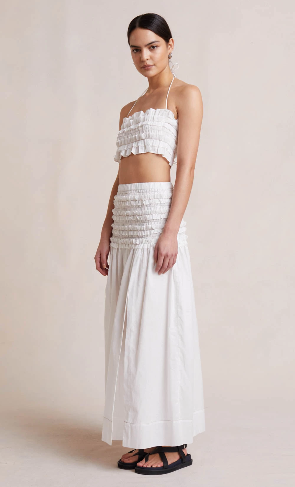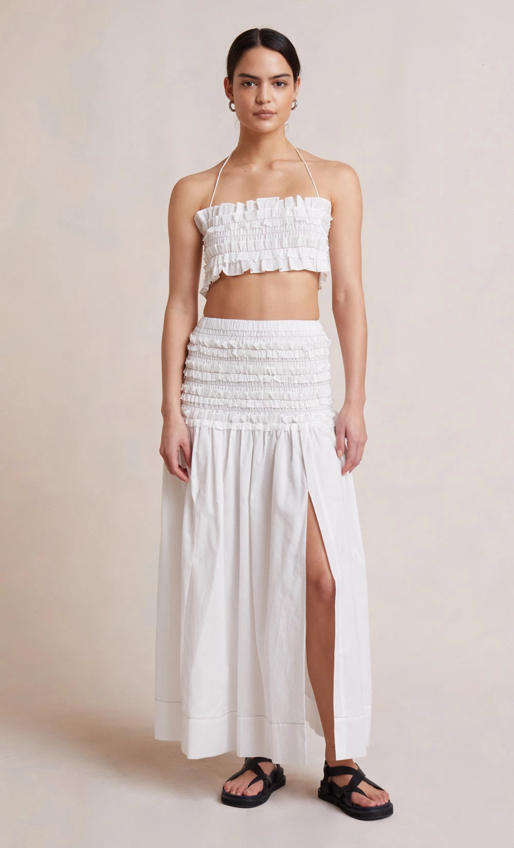 The Alina Skirt is an easy-to-wear style cut from a breezy cotton fabric. Designed to be fitted at the high waist, the skirt features a shirred drop waist paneling that flows into a maxi length, finished with a front side split leg. Styled with our matching Alina Crop Top.