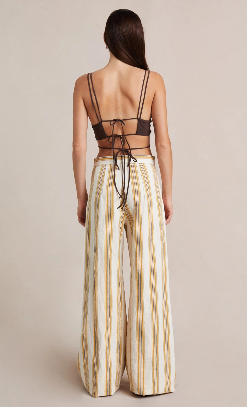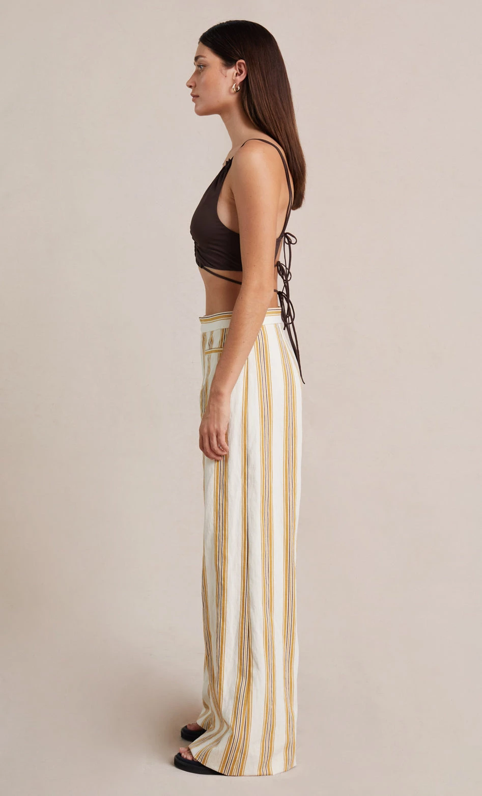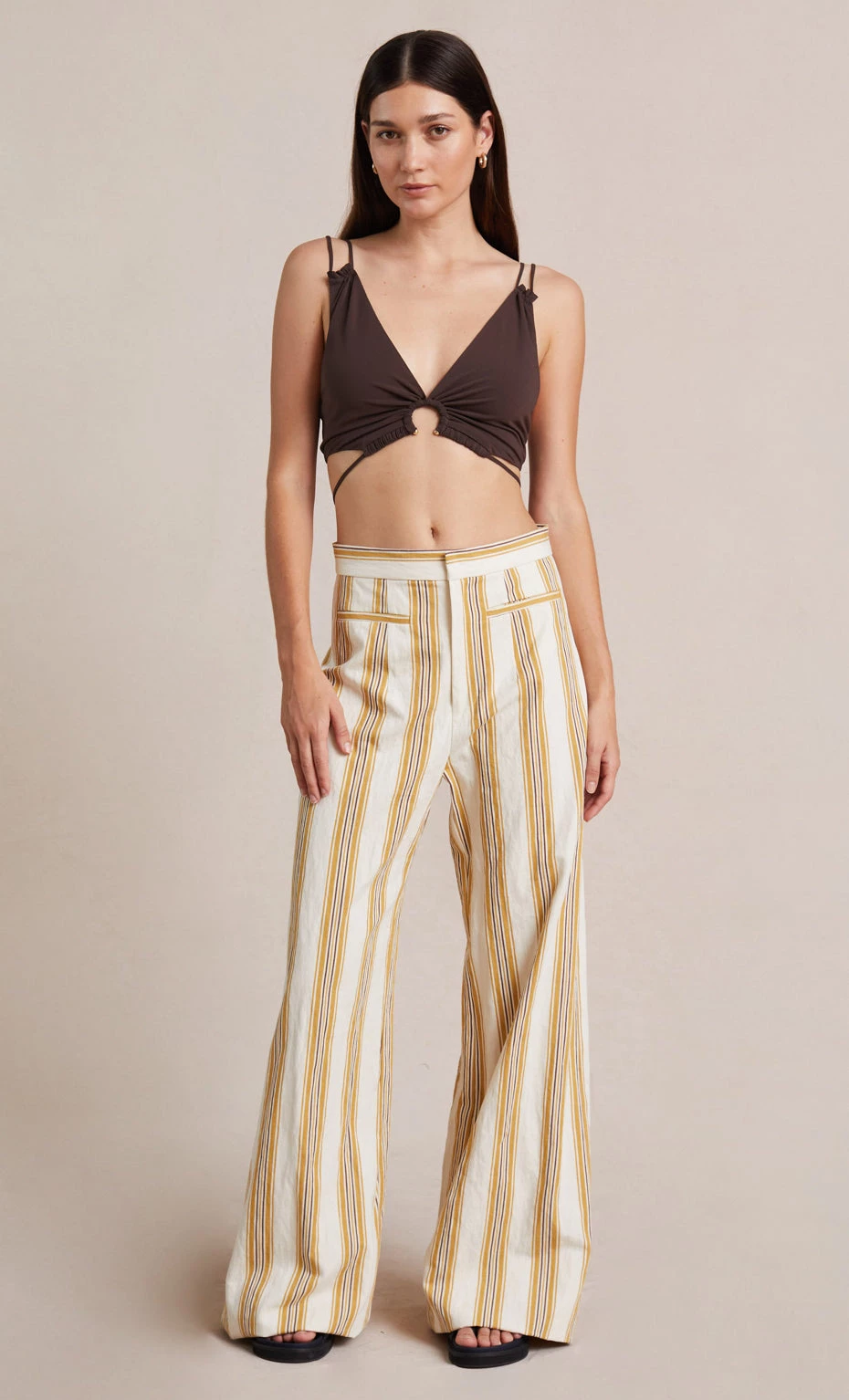 The Jasper Pant is a classic wide leg pant that is flattering on all silhouettes. This vintage inspired style is cut from our signature striped print cotton blend fabric. The pants have a fitted high waist, zip fly closure and front welt pockets. Styled with our Joelene V Crop Top.