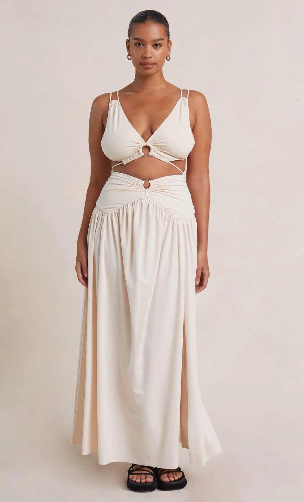 Inspired by a best selling silhouette, the Joelene Maxi Skirt is a flattering bias cut style with gathered detailing and a silver U-ring hardware detail at the front waist. The skirt is finished with a flowy skirt that falls into maxi length and a front split leg. Styled with our Joelene Top.