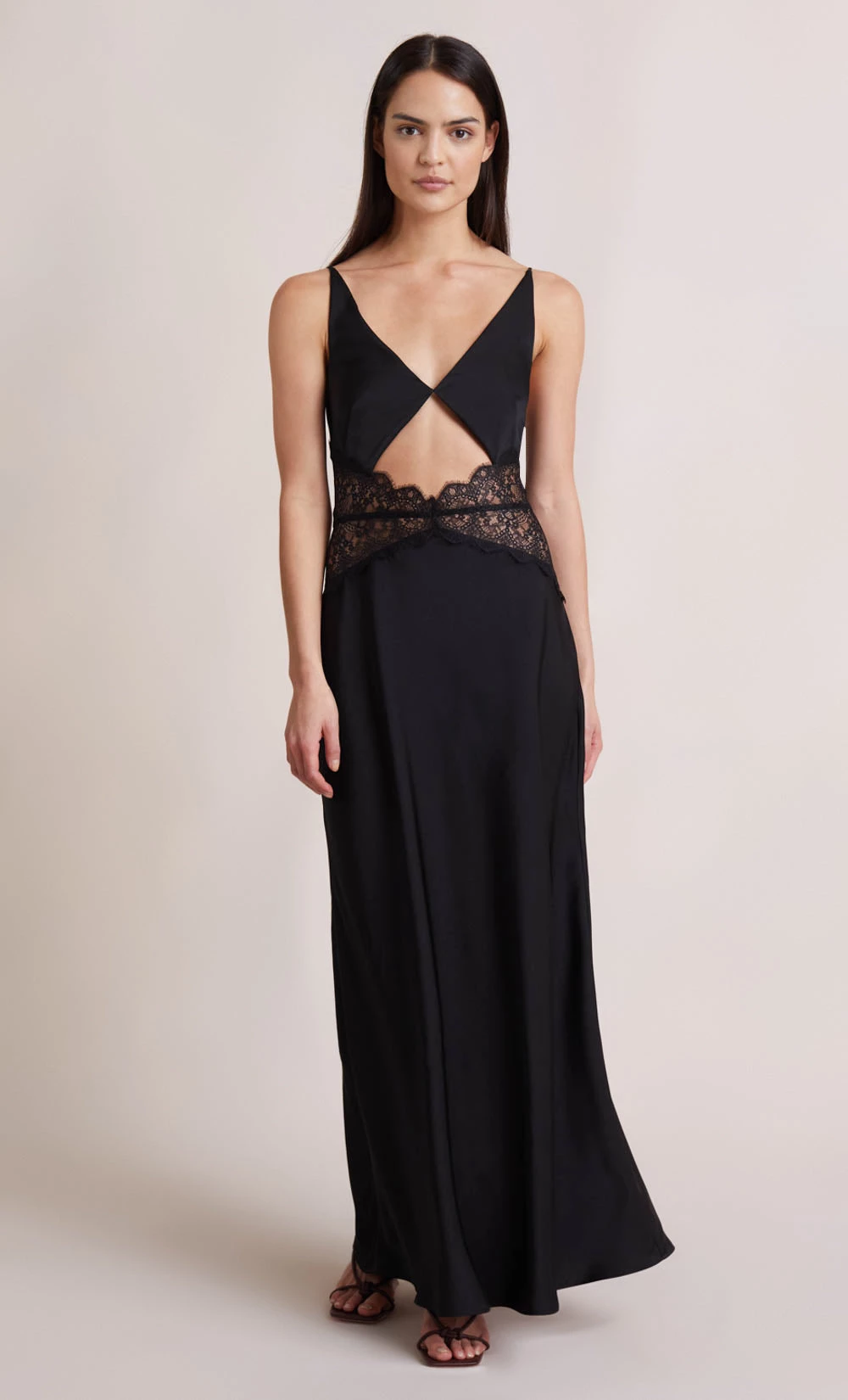 Effortless and elegant, the Camille Maxi Dress is a refined style with sweet lace panel detailing. The dress features classic triangles on the bodice with an underbust cutout, and thin roulea straps that lead to a flattering open back silhouette.