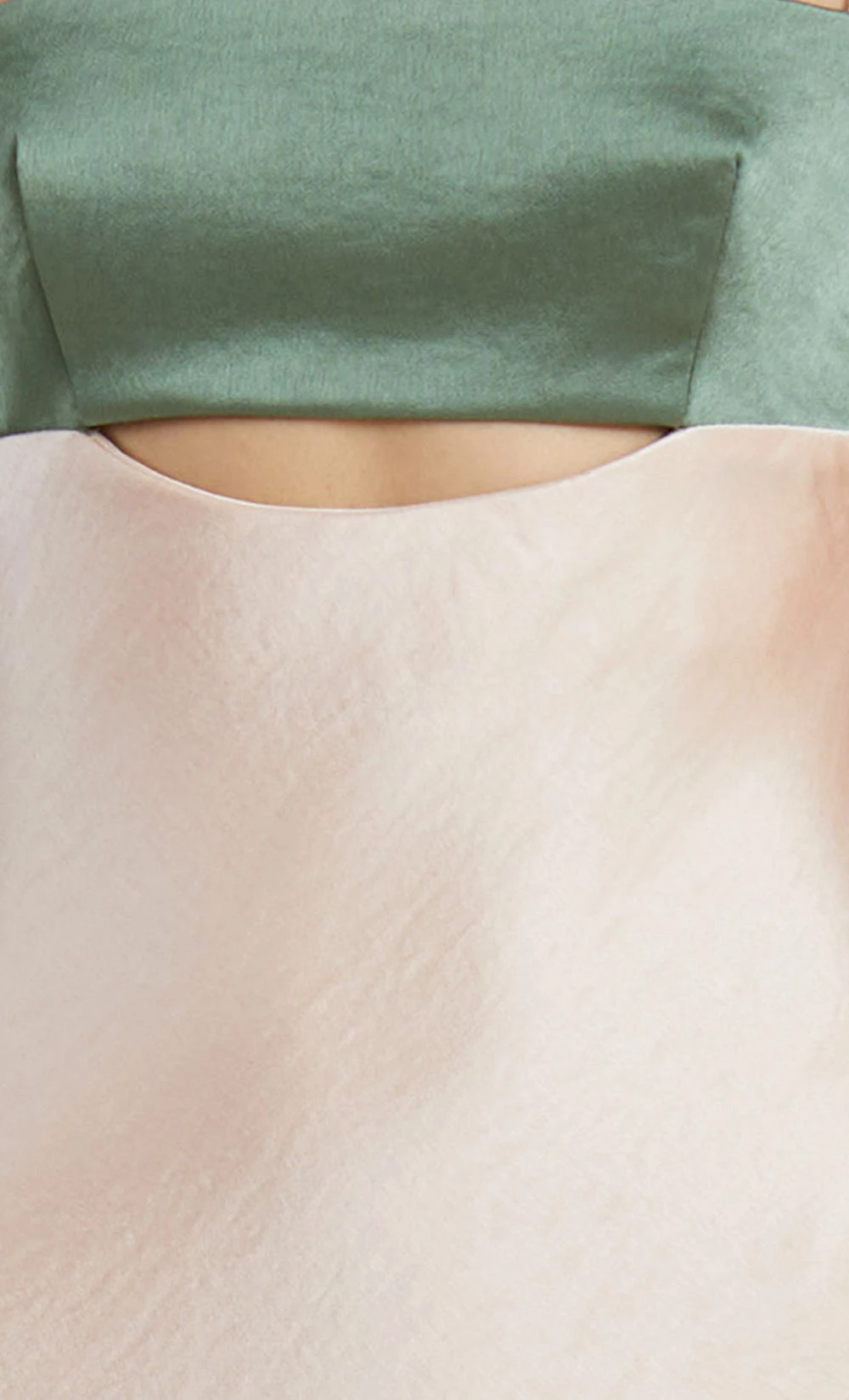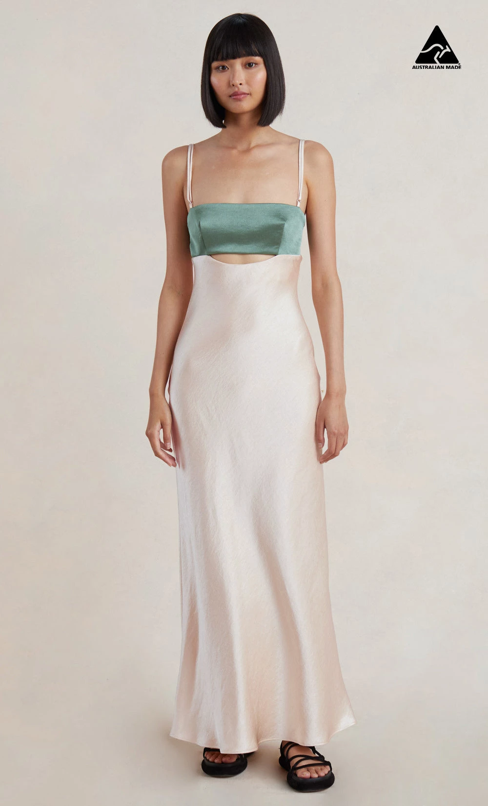 The Carrie Maxi Dress is a chic eventwear style cut from a fluid satin fabric. The dress features a straight neck in a flattering bias silhouette with thin rouleau straps and an underbust cutout.
