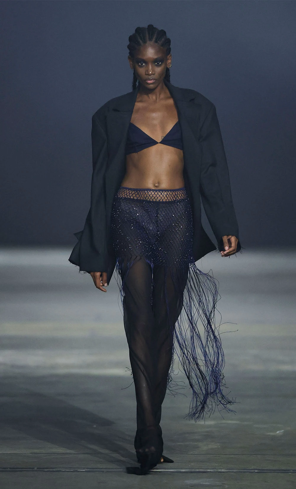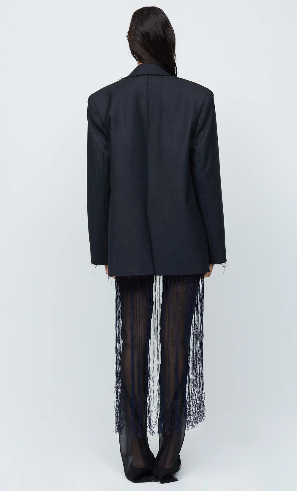 The 90’s inspired macramé Cartia Beaded Maxi Skirt is a statement piece. The mid-rise skirt features a fringed hem that falls into a midi length. Can be styled layered or on it’s own, styled here with our Floria Pant and Ronnie Jacket.