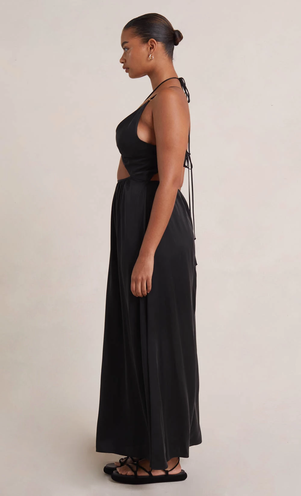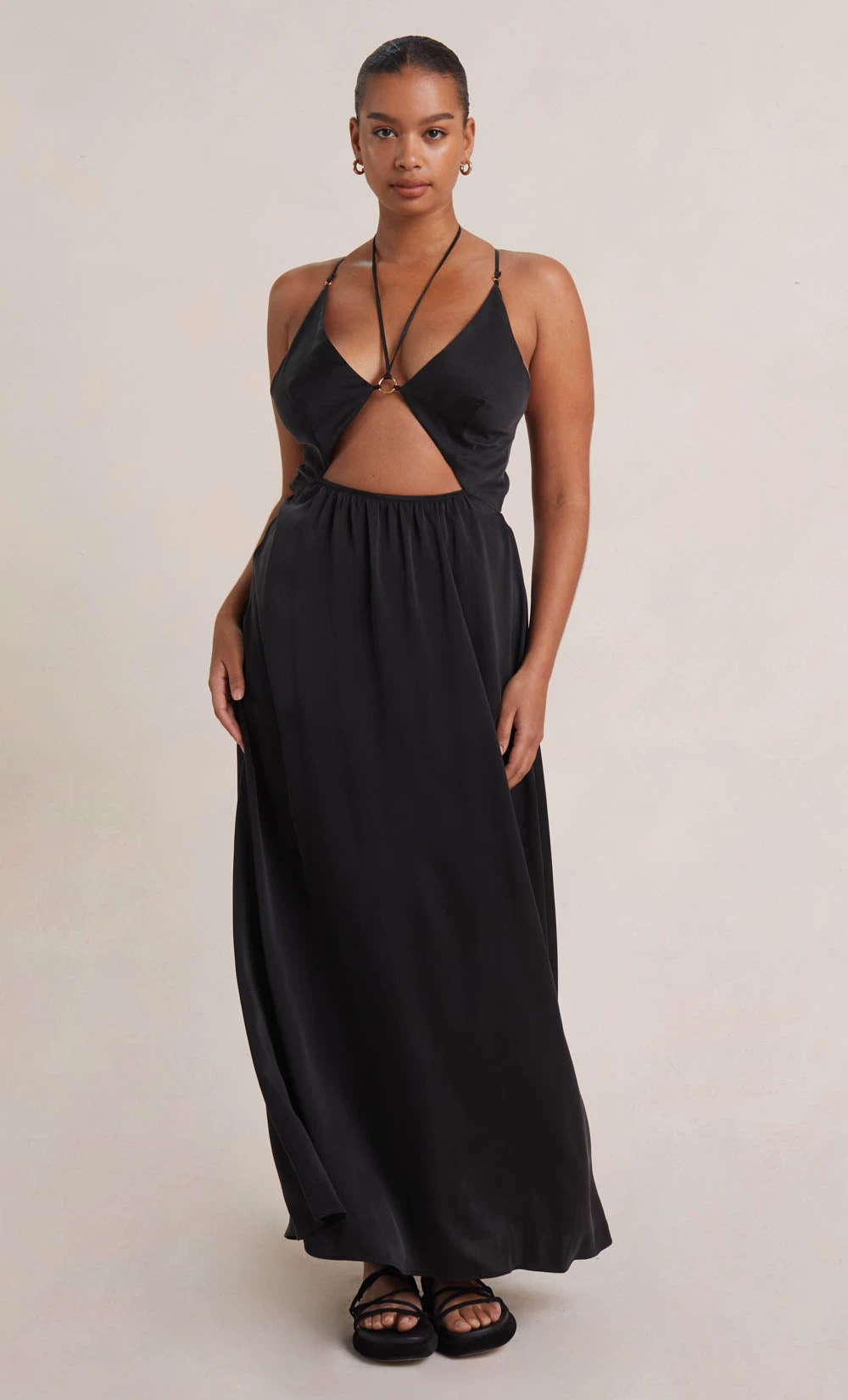 An effortless statement style, the Casablanca Maxi Dress is a strappy self-tie halter dress cut from a fluid silk fabric. The dress features a V-neckline accented with a rose gold O-ring and underbust cutouts. The flattering silhouette has a dropped waist that flows into a floaty maxi length skirt.