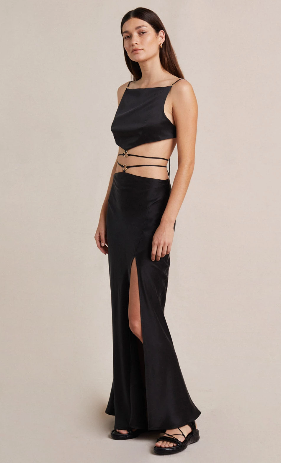 The Casablanca Maxi Skirt is a flowy maxi length style cut from a soft 100% silk fabric. The elasticated high waist is accented with a strappy rose gold O-ring detail, drop waist panelling that falls into a gathered skirt and is finished with a front split leg. Styled with our Casablanca Top.