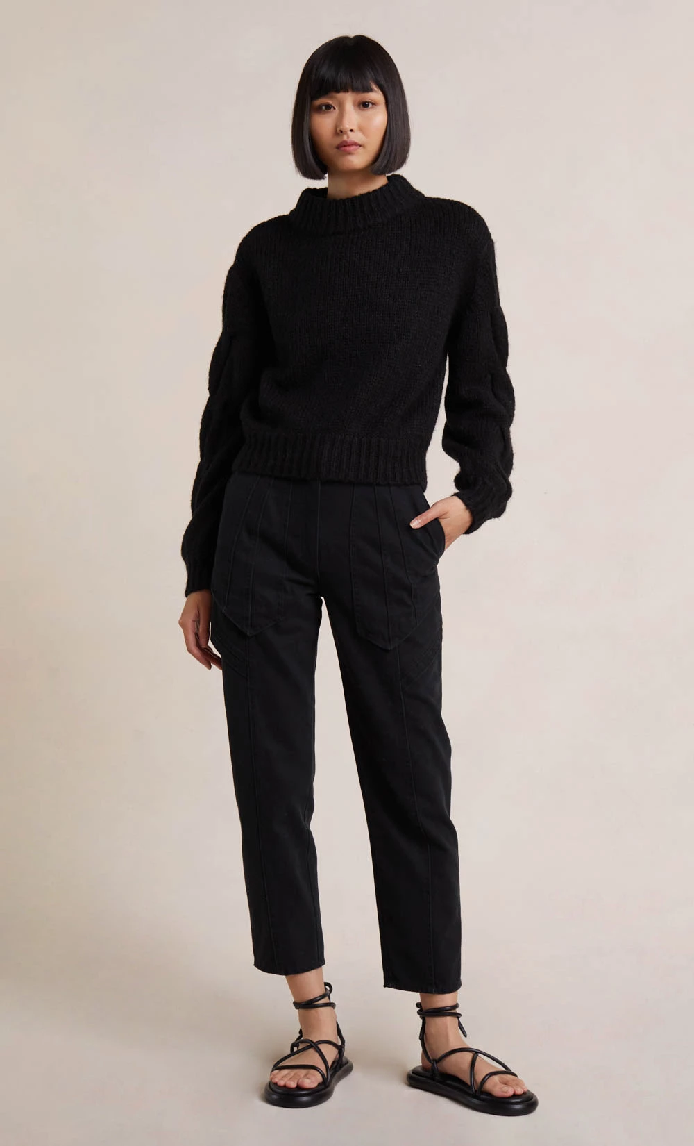 The Celeste Knit Jumper is a winter wardrobe staple cut in a slightly cropped silhouette. The knit features a slight high neck, rib detailing on the neck and cuffs and statement knitted twist detailing down the sleeves.