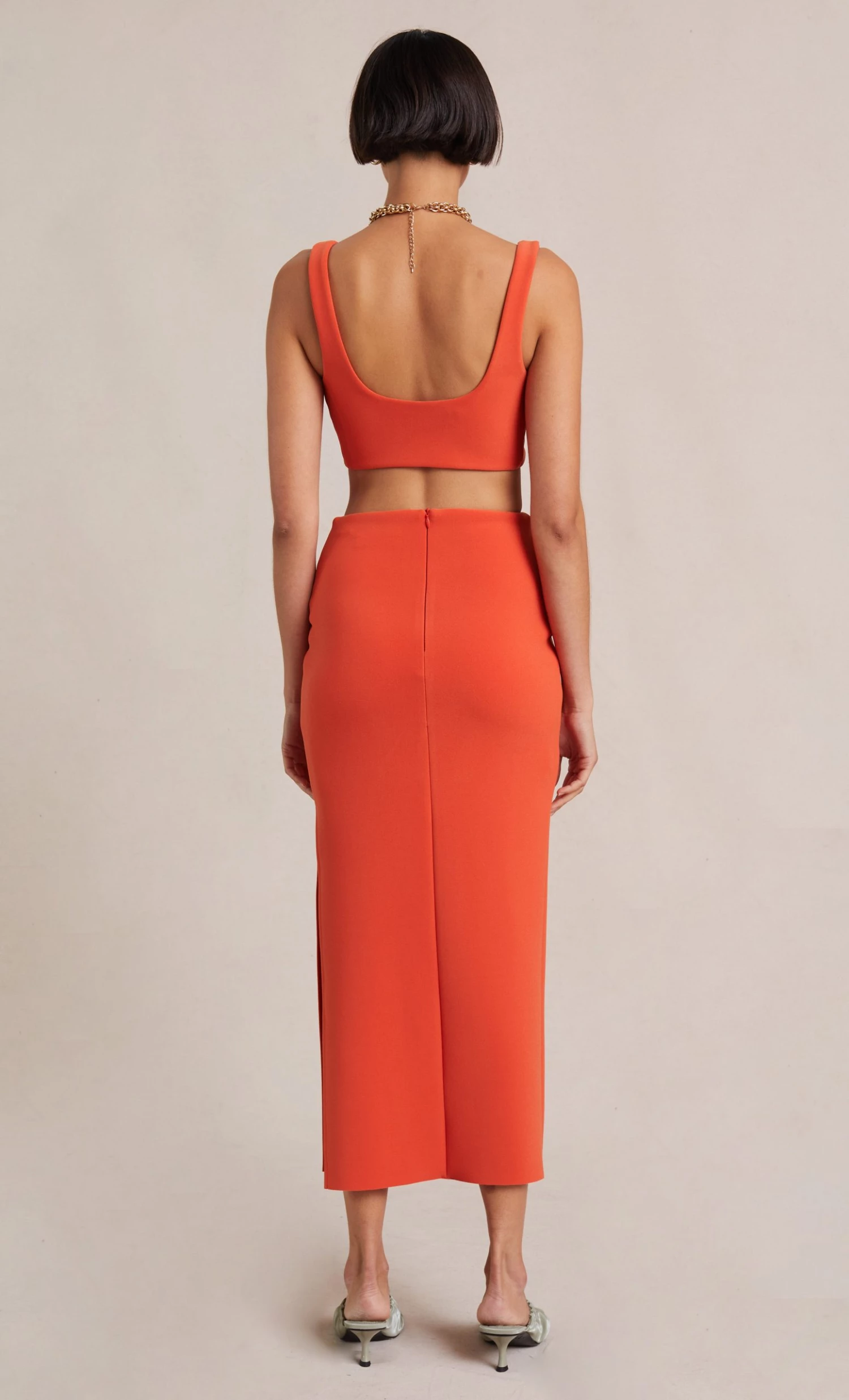 Bonded crepe twist front midi skirt. Styled with our Clover Crop Top