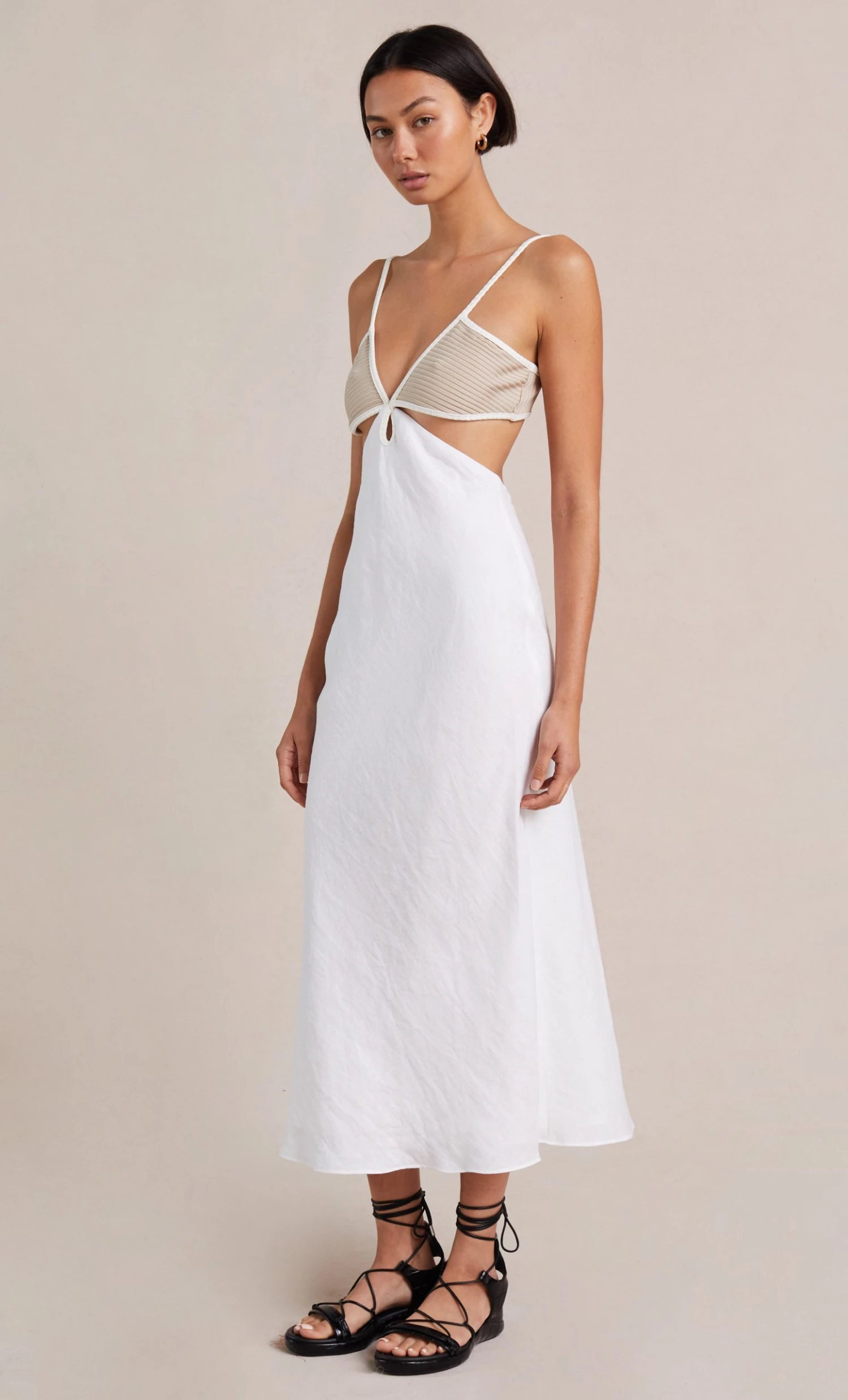 The Demi Midi Dress is a chic eventwear style cut from a linen and contrast fabric that hugs the silhouette. The dress features a plunging v-neckline and a keyhole detail with statement cutouts underneath the bust that lead an open back.