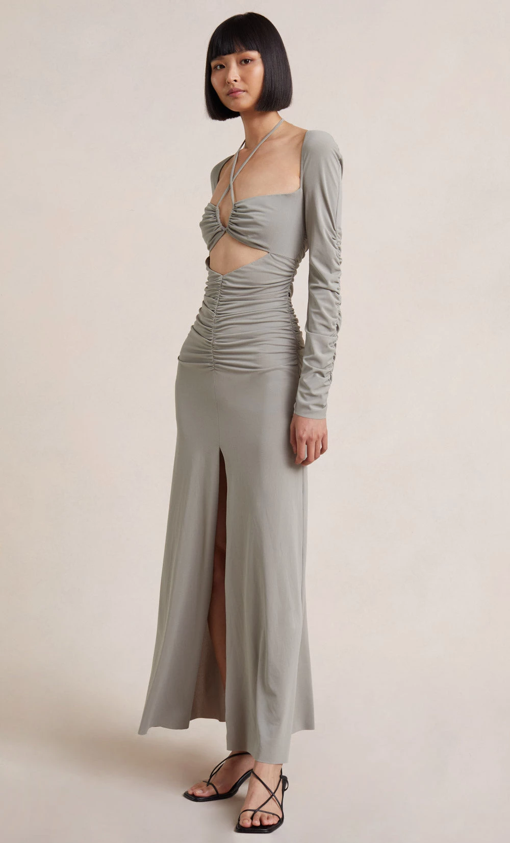 Make an entrance in the Adaline Long Sleeve Maxi Dress. Featuring a gathered bodice, centre-front split and rouleau straps, the diamond cut-out maxi dress is a chic, statement style.