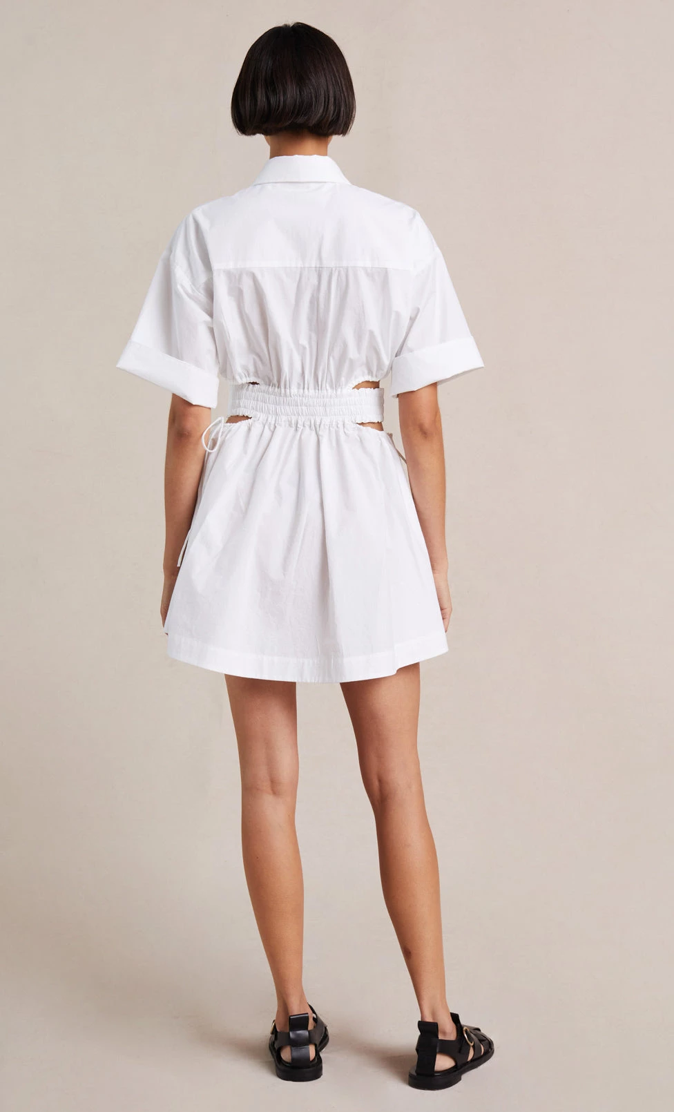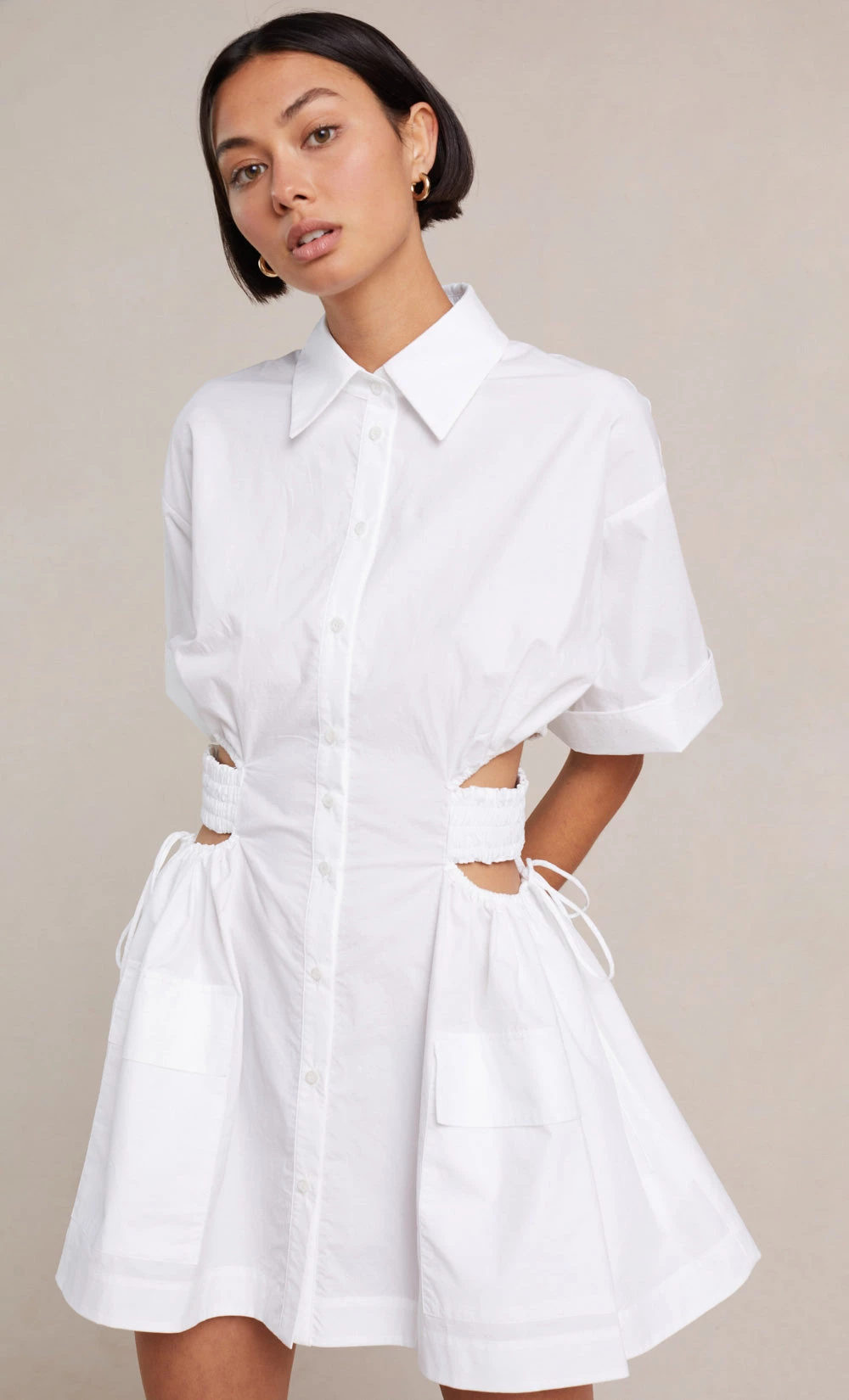 The Alita Short Sleeve Mini Dress is a shirt dress inspired mini cut from a lightweight woven fabric. The Alita Short Sleeve Mini Dress features side cut outs with elasticated strap details and side ties. The mini dress is finished with a neat collar, button up front closure and cuffed elbow length sleeves.