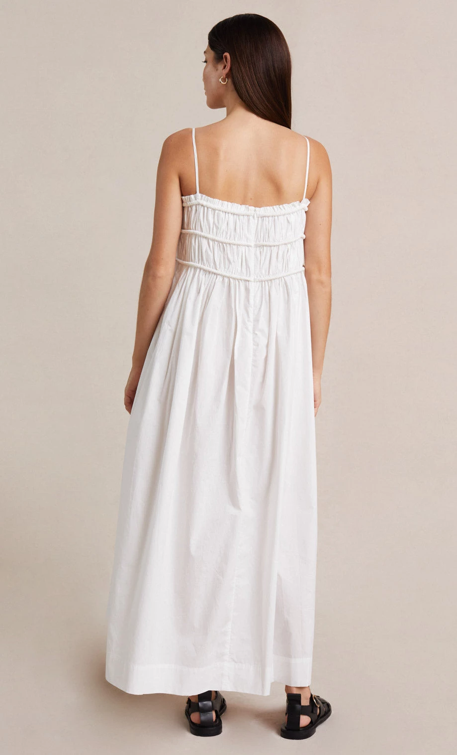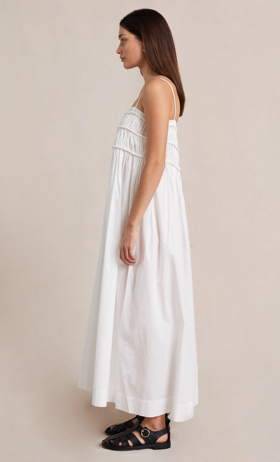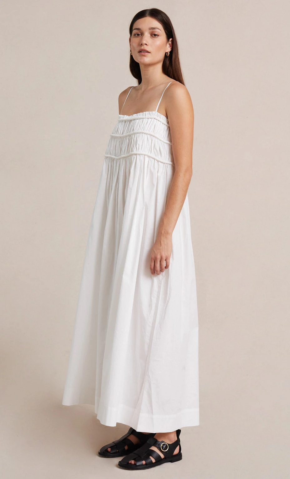 The Eli Maxi Dress is an easy-to-wear cotton dress designed with an oversized silhouette. The maxi dress features a straight neckline with a shirred gathered bust.