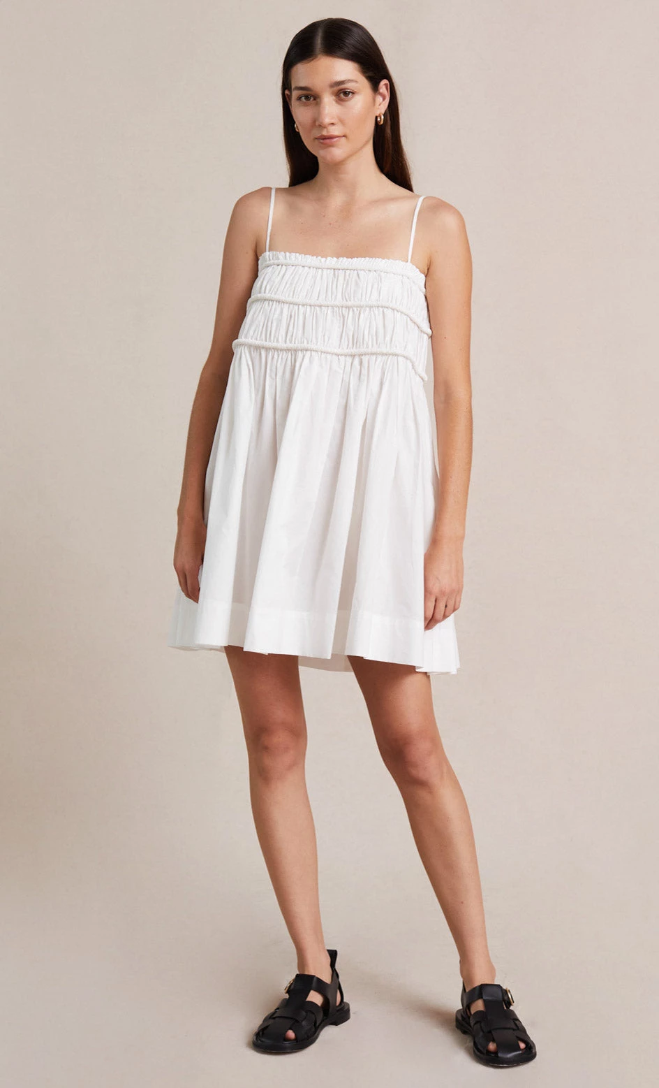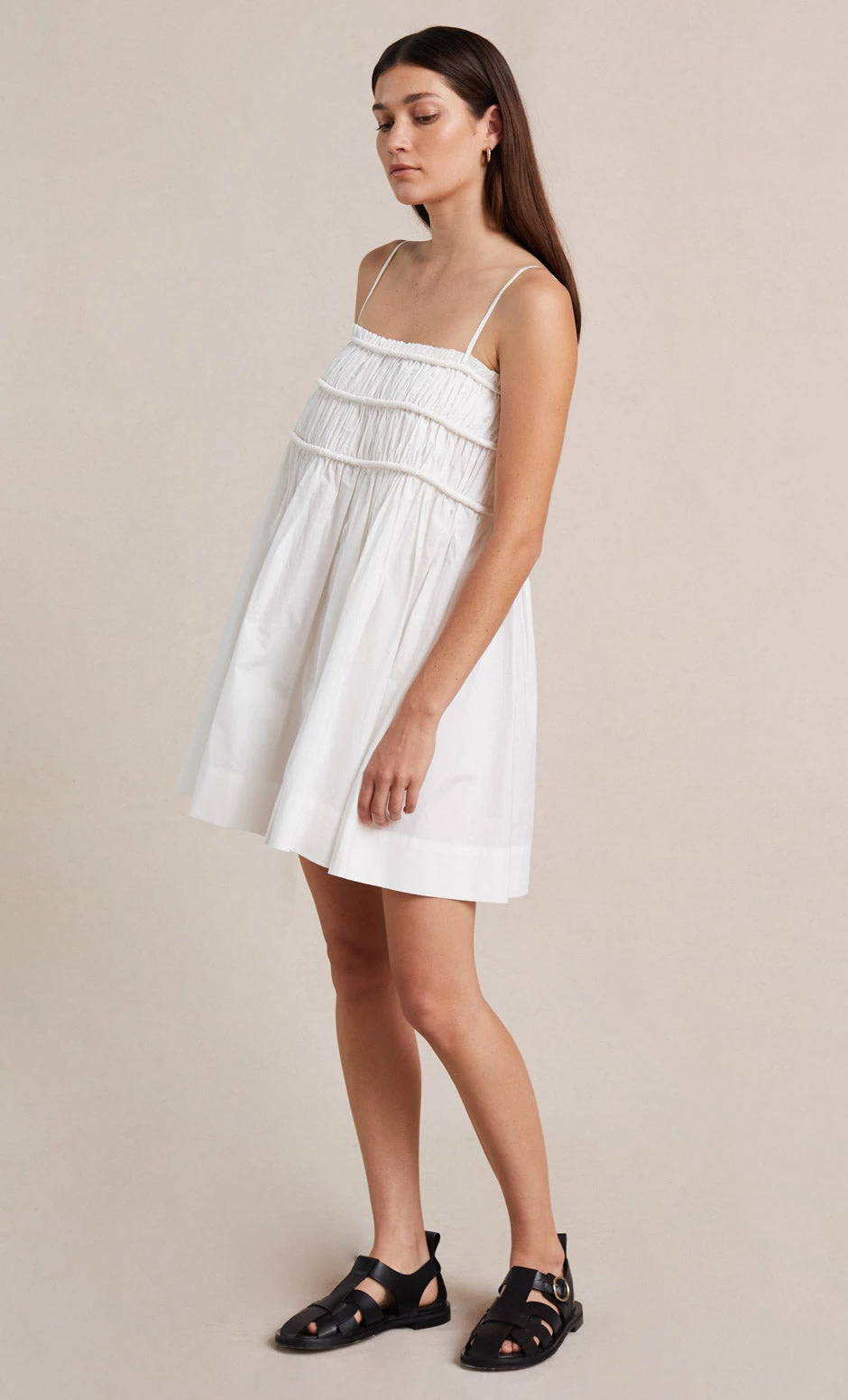 The Eli Mini Dress is an easy-to-wear cotton dress designed with an oversized silhouette. The mini dress features a straight neckline with strappy rouleau straps and a shirred gathered bust.