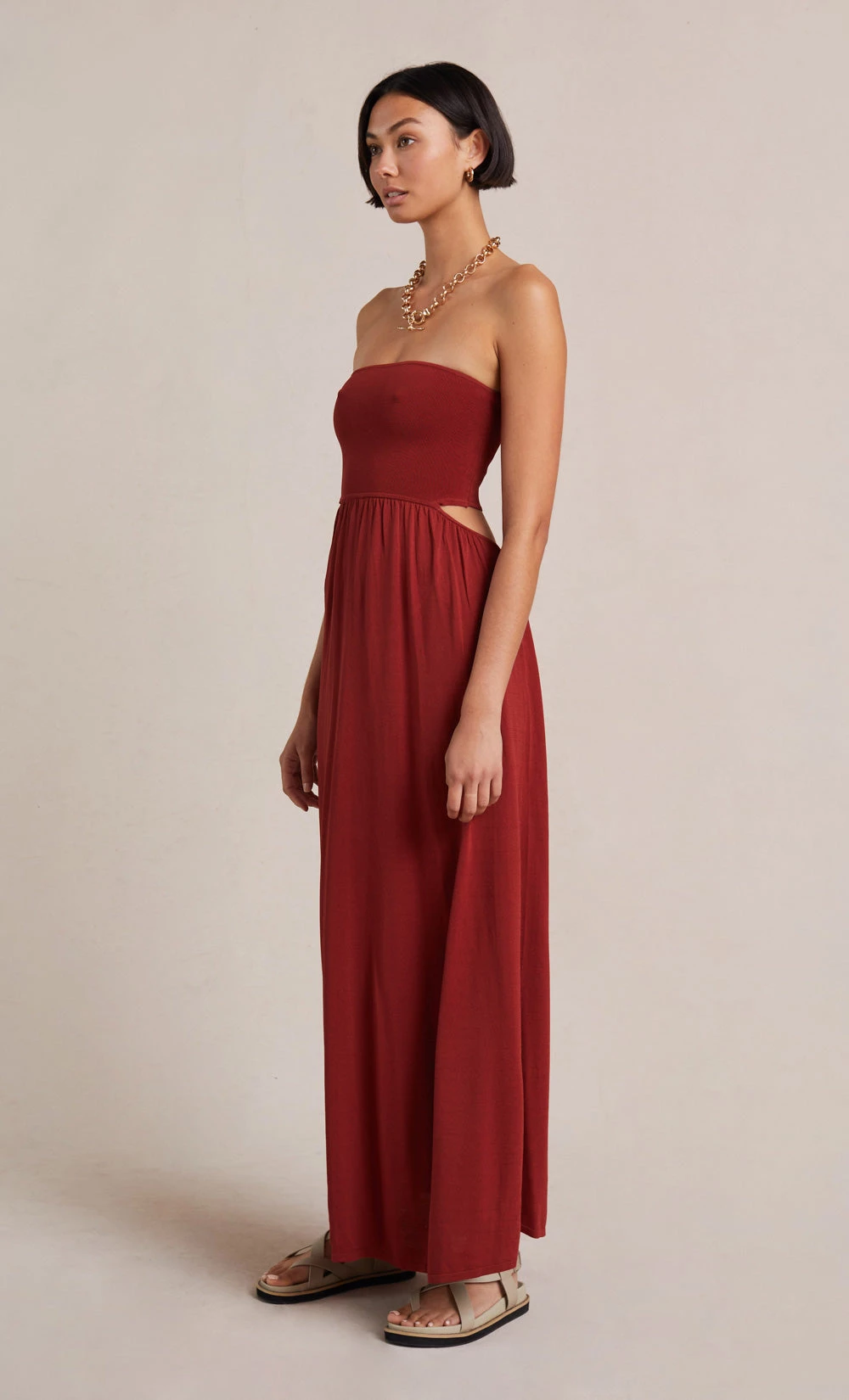 The Poppy Knit Cut Out Dress features a stretch knit bandeau style top that cinches in at the high waist and falls into a floaty, relaxed ankle length skirt. This bandeau maxi dress features a straight neckline with a cut out waist and back.