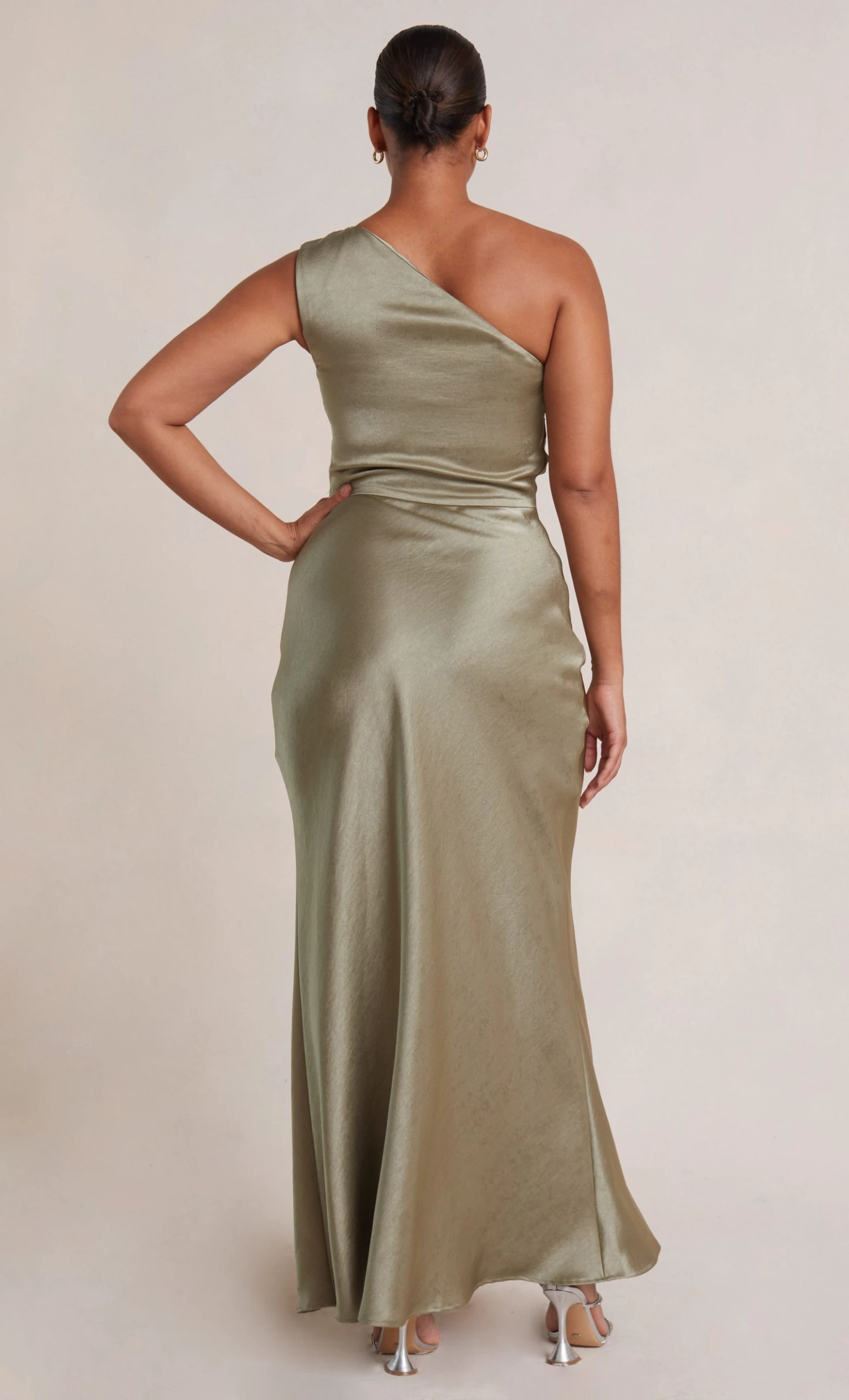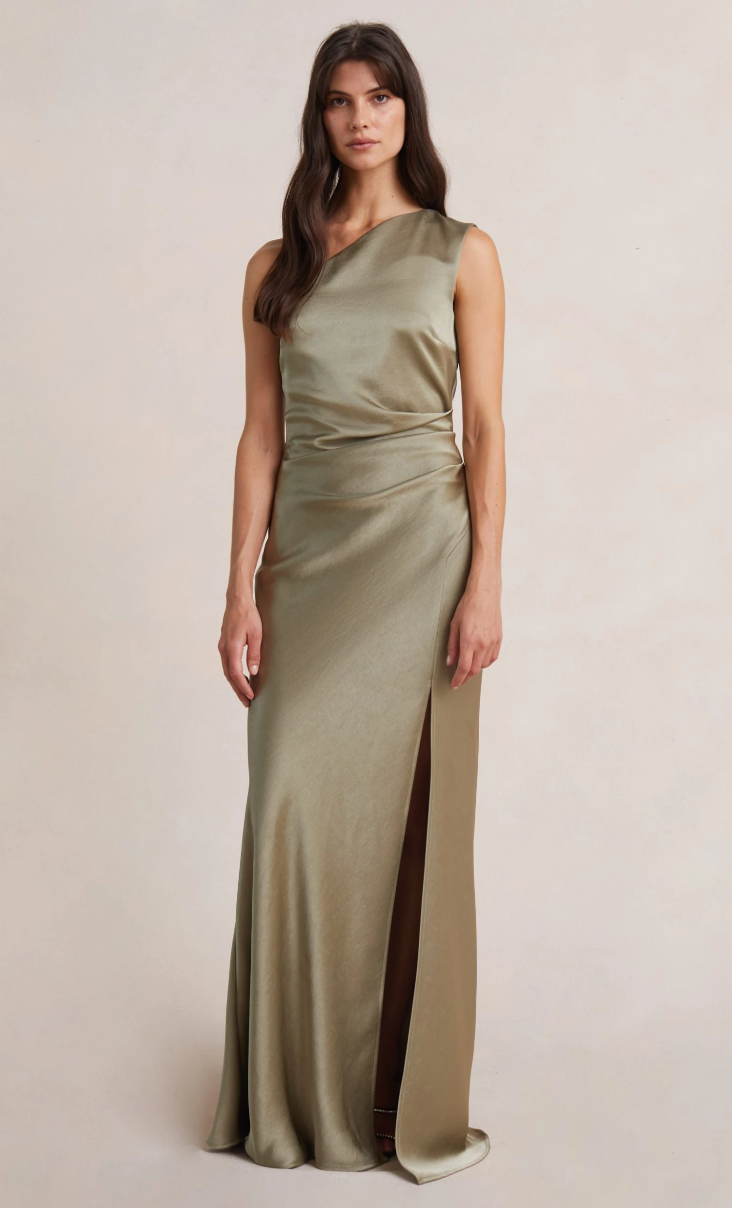 Flattering one shoulder maxi dress with asymmetrical neckline, side tuck detailing over the hips and waist, and a statement leg split.