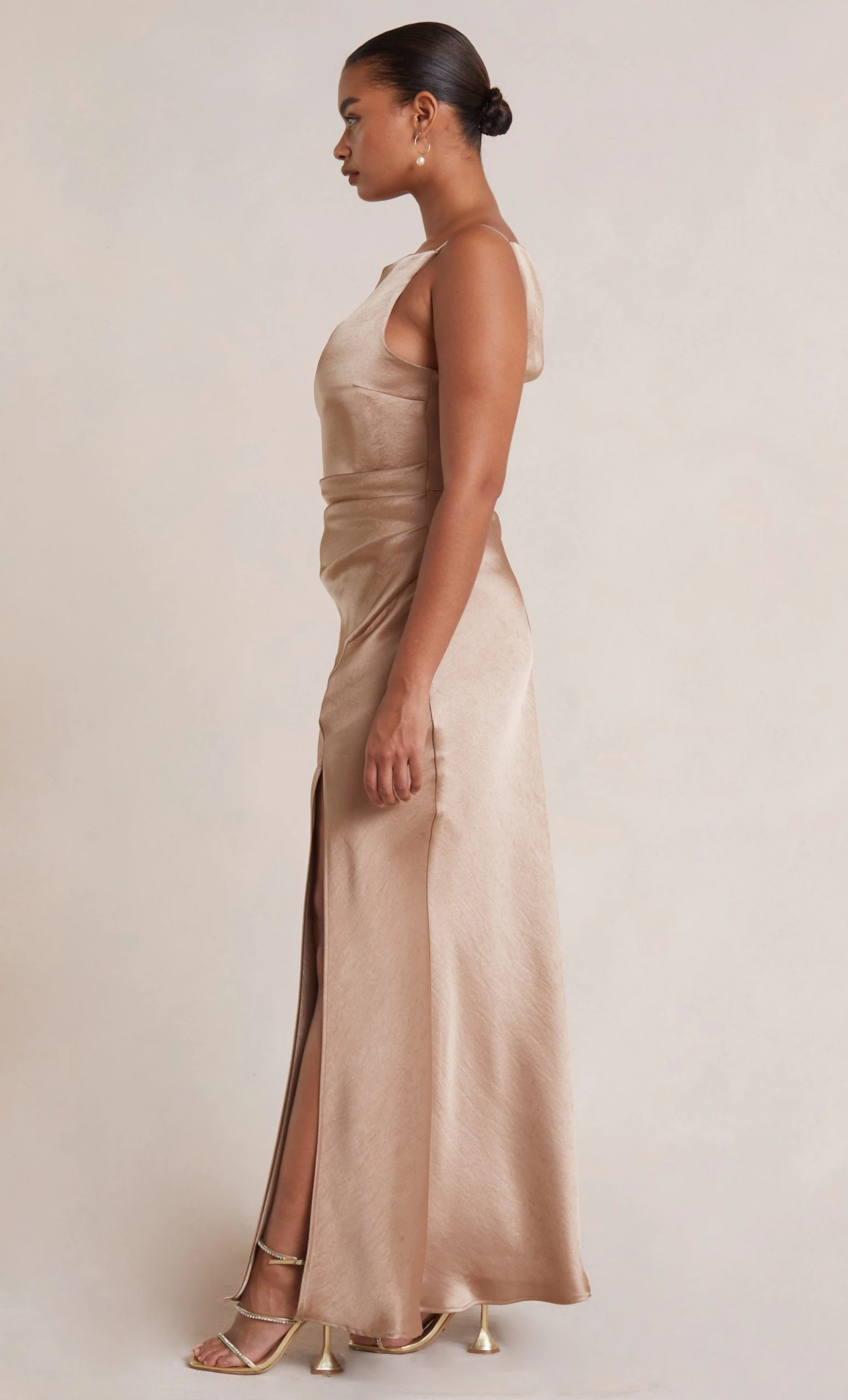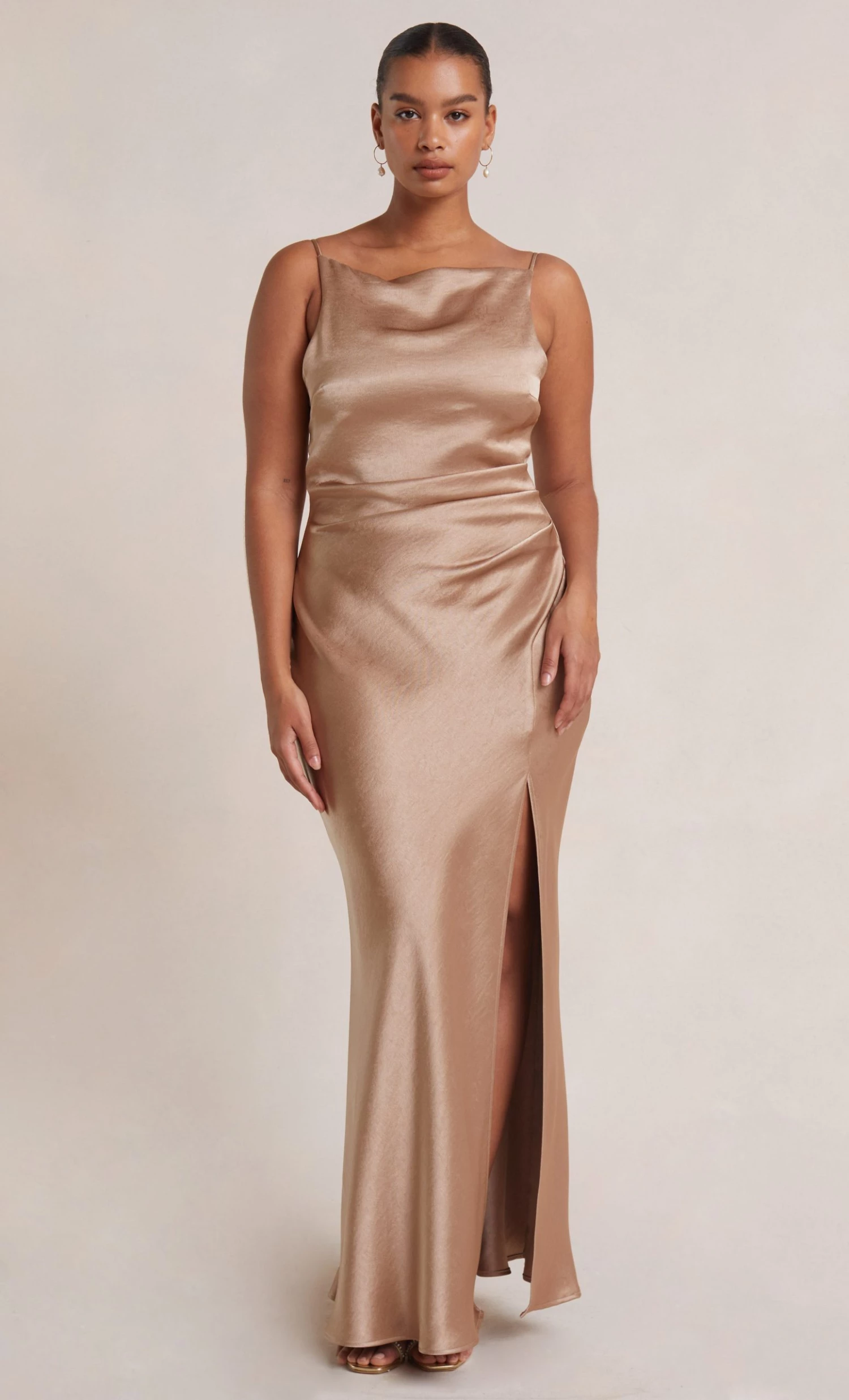 Best selling, high neck maxi dress featuring a flattering tuck detail that cinches the waist and creates a feminine silhouette. Dress is accessed through an invisible side zipper.