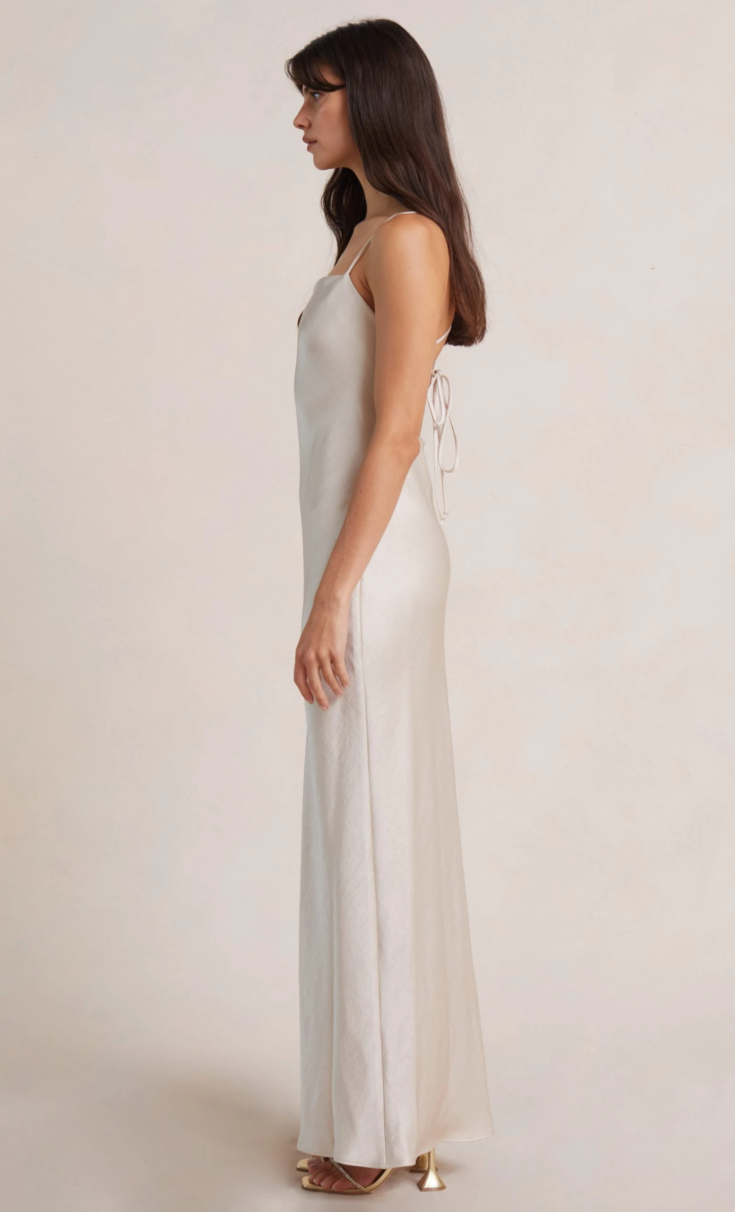 Cowl neck maxi dress with a low square back featuring an adjustable tie detail.