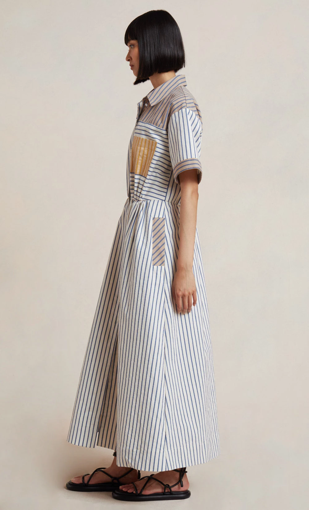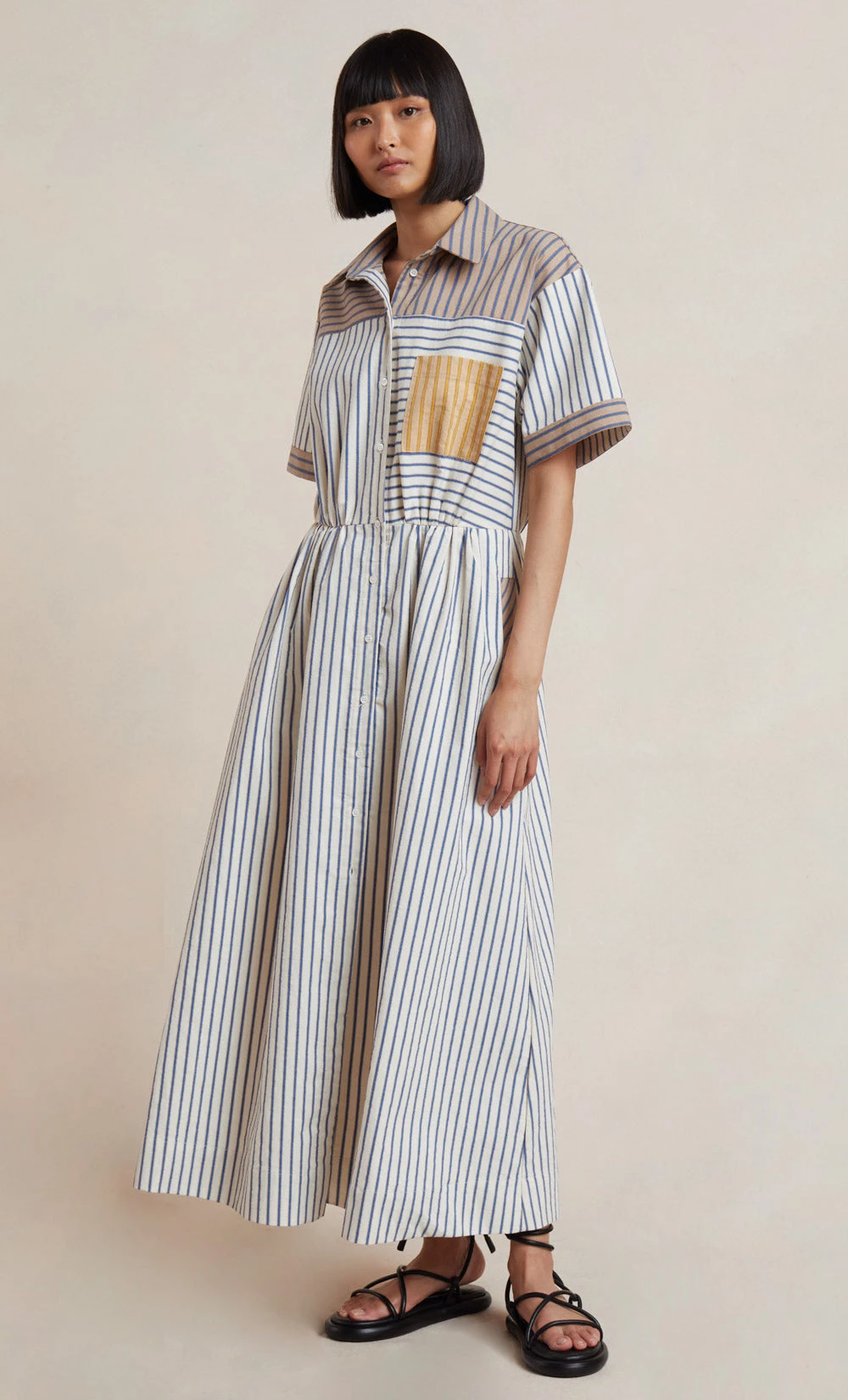 The Tori Shirt Dress is an easy-to-wear style cut from a signature striped print fabric. The dress features contrasting details in a relaxed fit with a neat collar, front button placket closure and short sleeves. Complete with an elasticated waist that falls into a full midi skirt and front patch pockets.