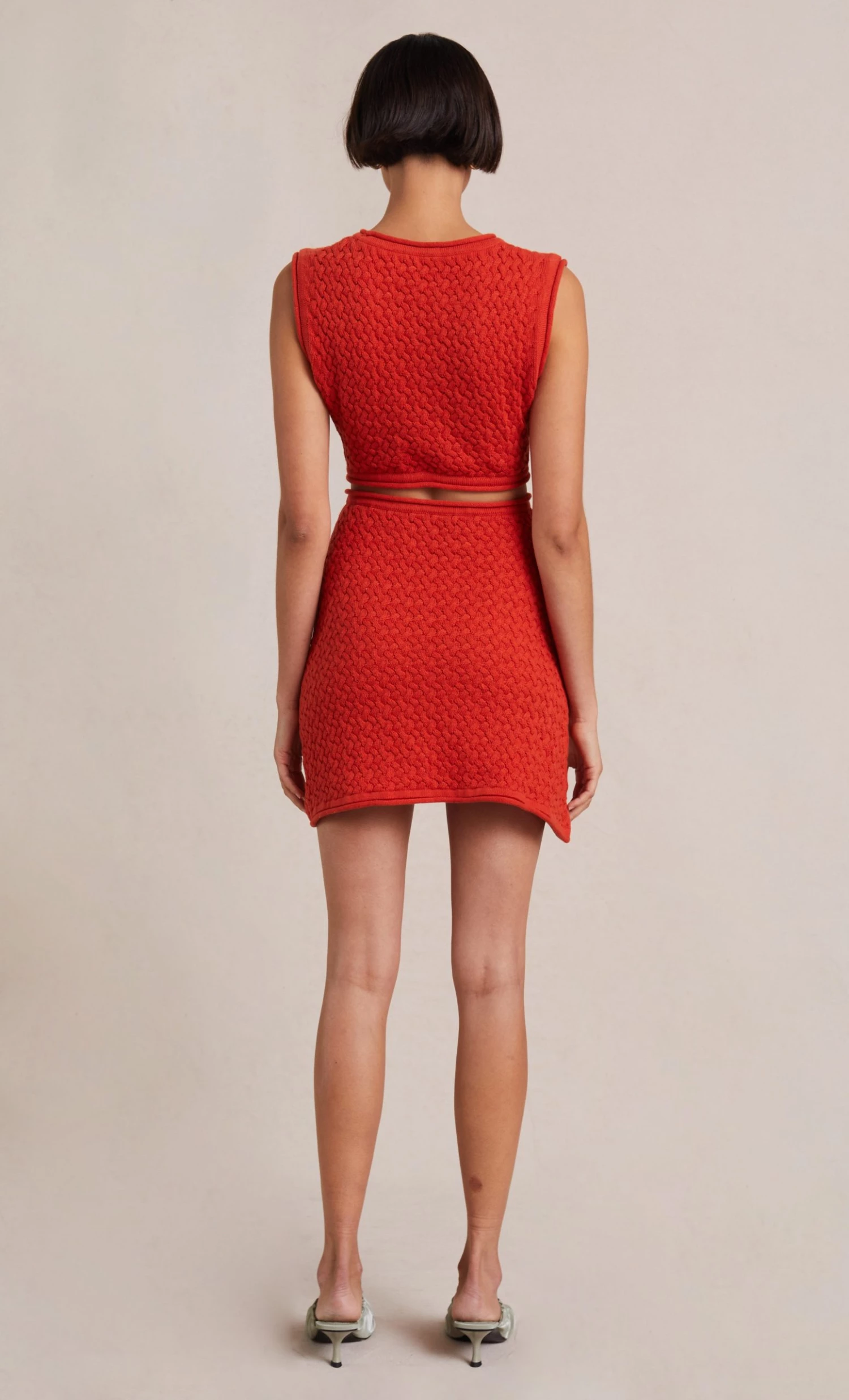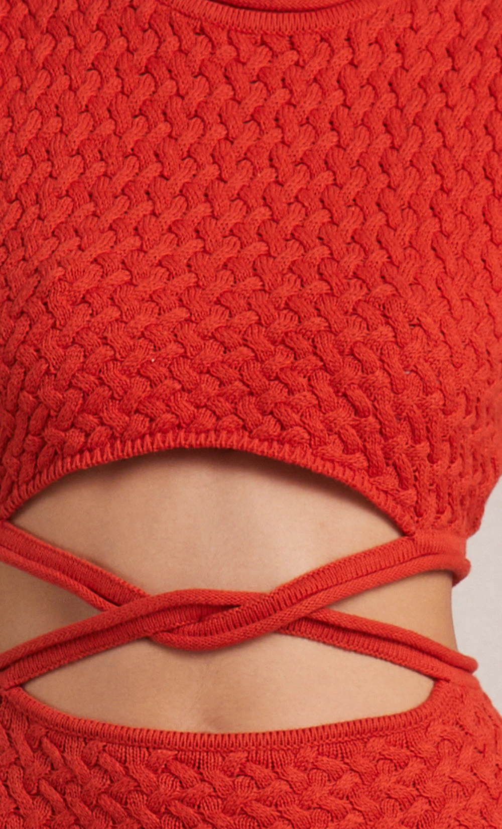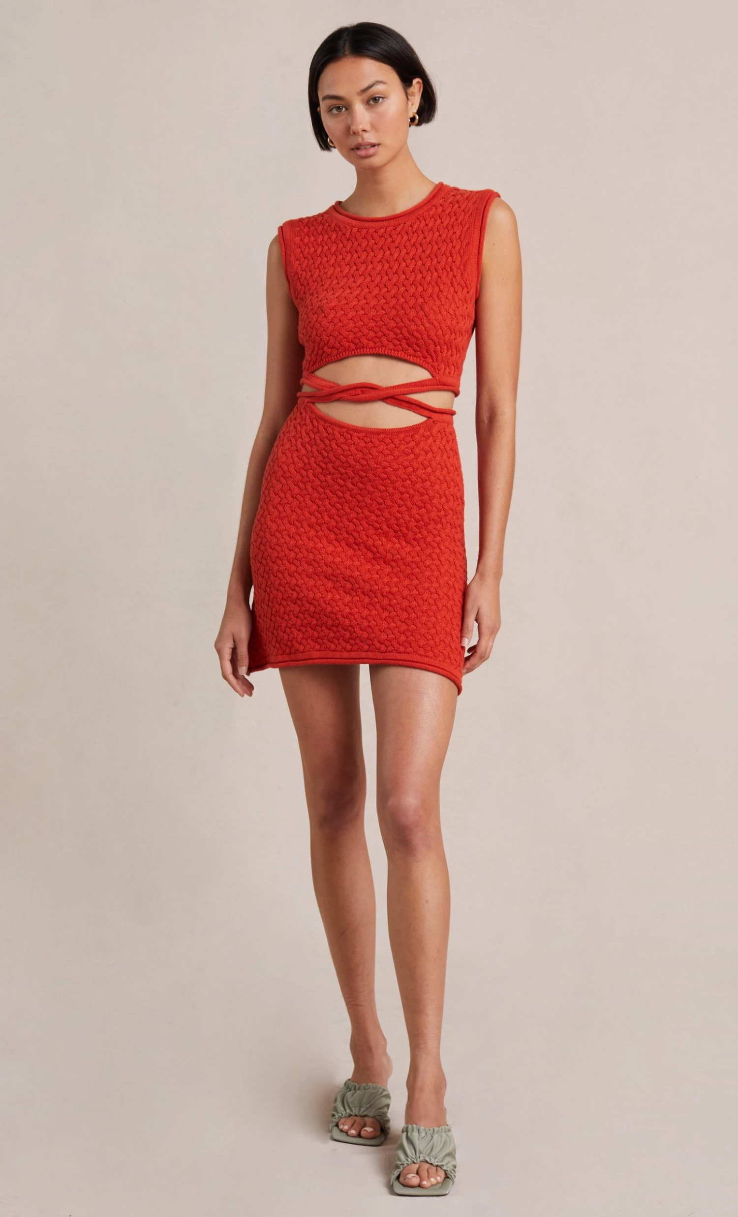 Spun from a unique basket-weave textured knit fabric that skims the silhouette, the Effie Knit Mini Dress is a chic fitted mini style with a cut out waist that wraps around to an open back. The mini dress is finished with a twist braided detail across the waist.