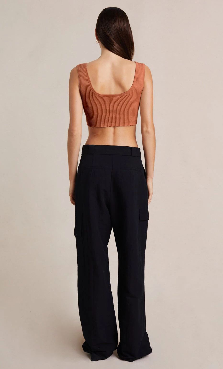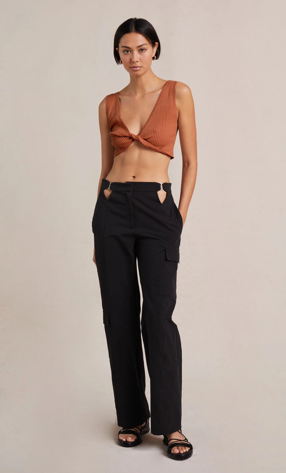 A statement style, the Elijah Knit Twist Top is spun from a ribbed linen blend fabric that hugs the silhouette. This sleeveless top features a plunging twist V-neckline in a cropped silhouette. Styled with our Claude Pant.