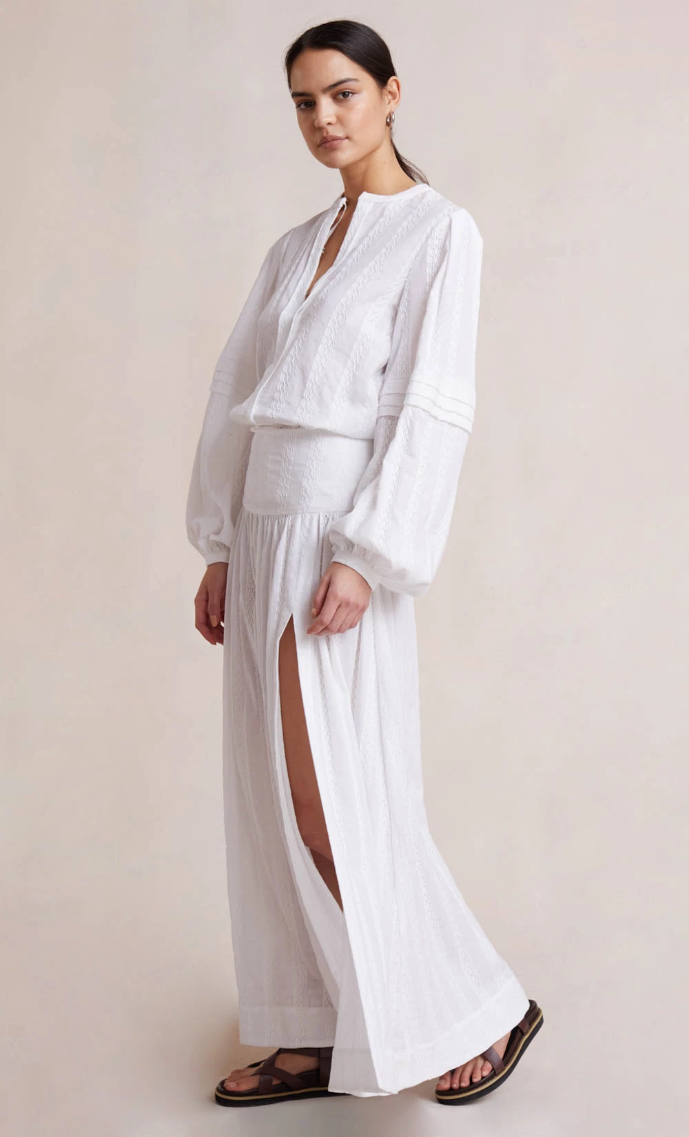 Cut from a breezy cotton fabric, the Elodie Blouse is an easy-to-wear style with a plunge neckline and an adjustable tie across the neckline. The blouse features billowy puff sleeves complete with pintuck details. Styled with our matching Elodie skirt.