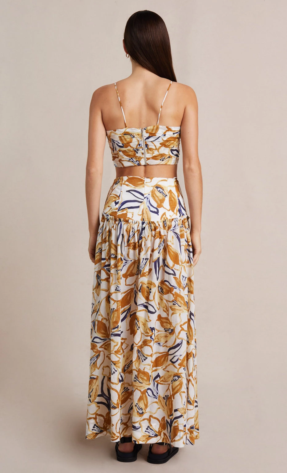 The Eugenie Maxi Skirt is flowy ankle length style cut from a signature floral print cotton fabric. The maxi skirt cinches in at the high waist with drop waist panelling that falls into a gathered skirt with a thigh high front split leg detail. Styled with our matching Eugenie Lace Up Top.