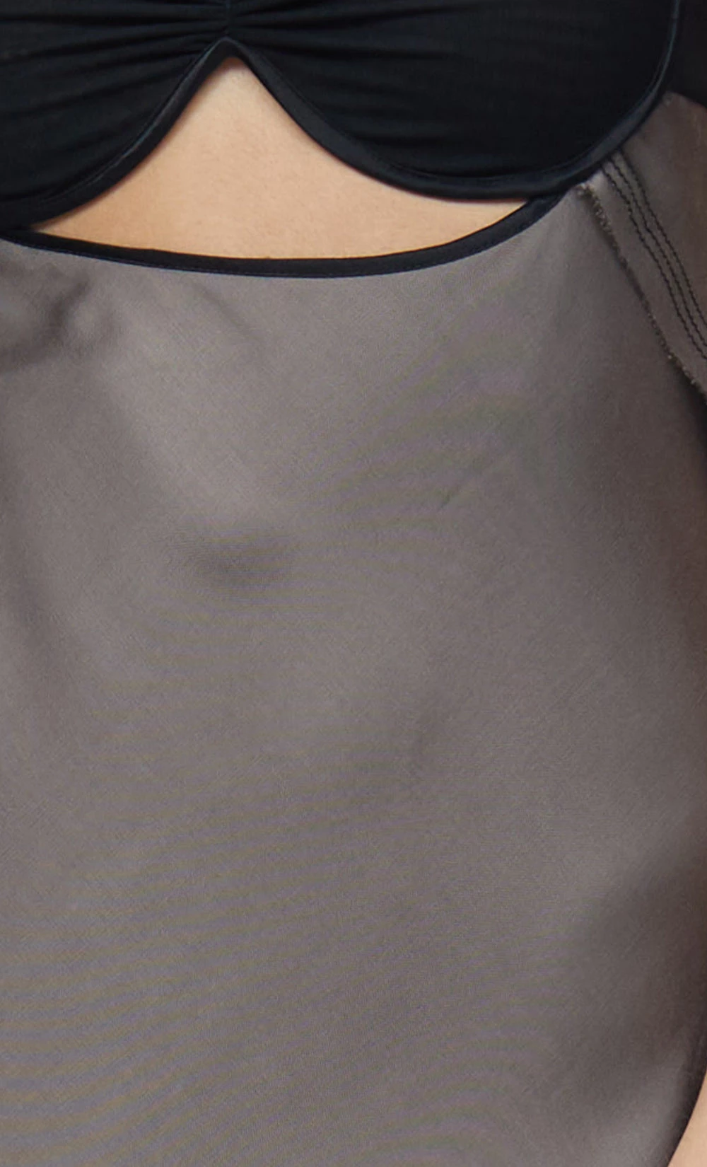 The effortless Evangeline Strappy Maxi Dress skims the body in a flattering silhouette. The statement maxi dress is cut from a twill fabric with a cotton tulle bralette contrast. The dress is complimented by raw edge detailing, contrast top stitching on the edges, thin straps and a low open back.