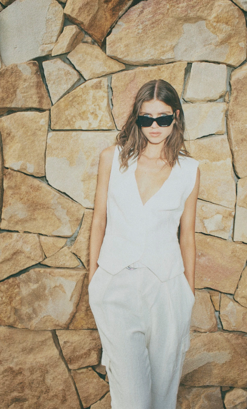 The Fletcher Vest is a relaxed take on the classic tailored vest. Cut from a breezy linen fabric, the vest has a slightly oversized fit with a V-neck collar and 3-button front closure. The relaxed styling of the vest is cinched in with an adjustable back detail. Styled with our matching Fletcher Pant.