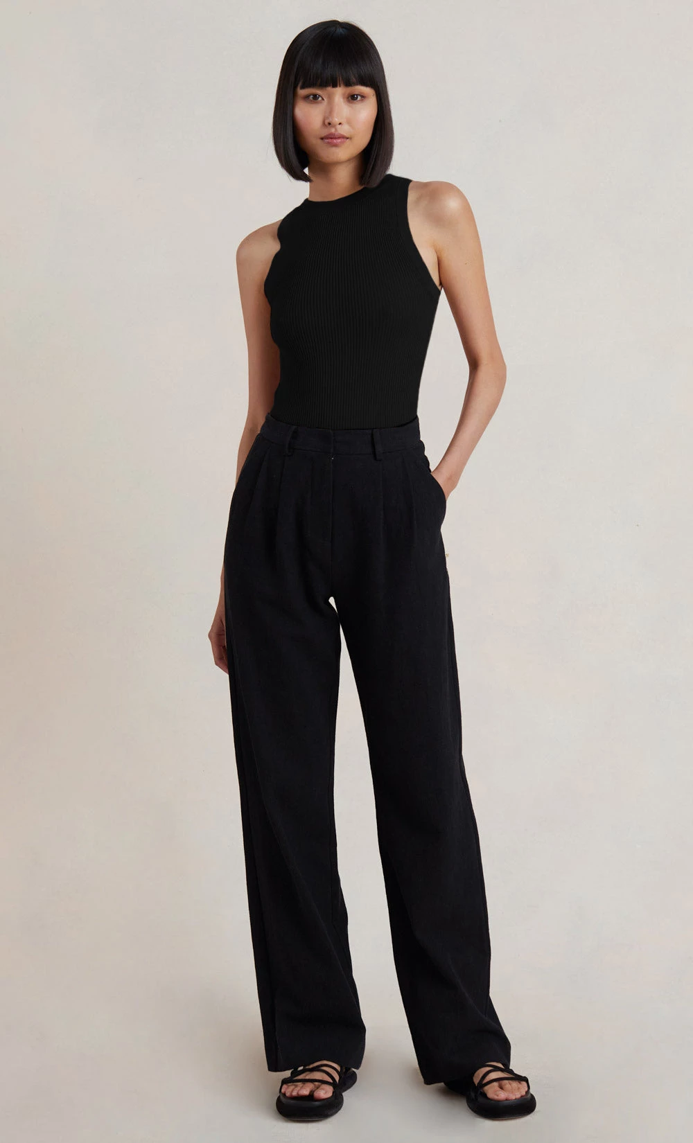 An effortless and easy-to-wear style, the Francesca Knit Top is spun from a ribbed knit cotton fabric and features a classic tank silhouette with a high boat neckline and armsyces.
