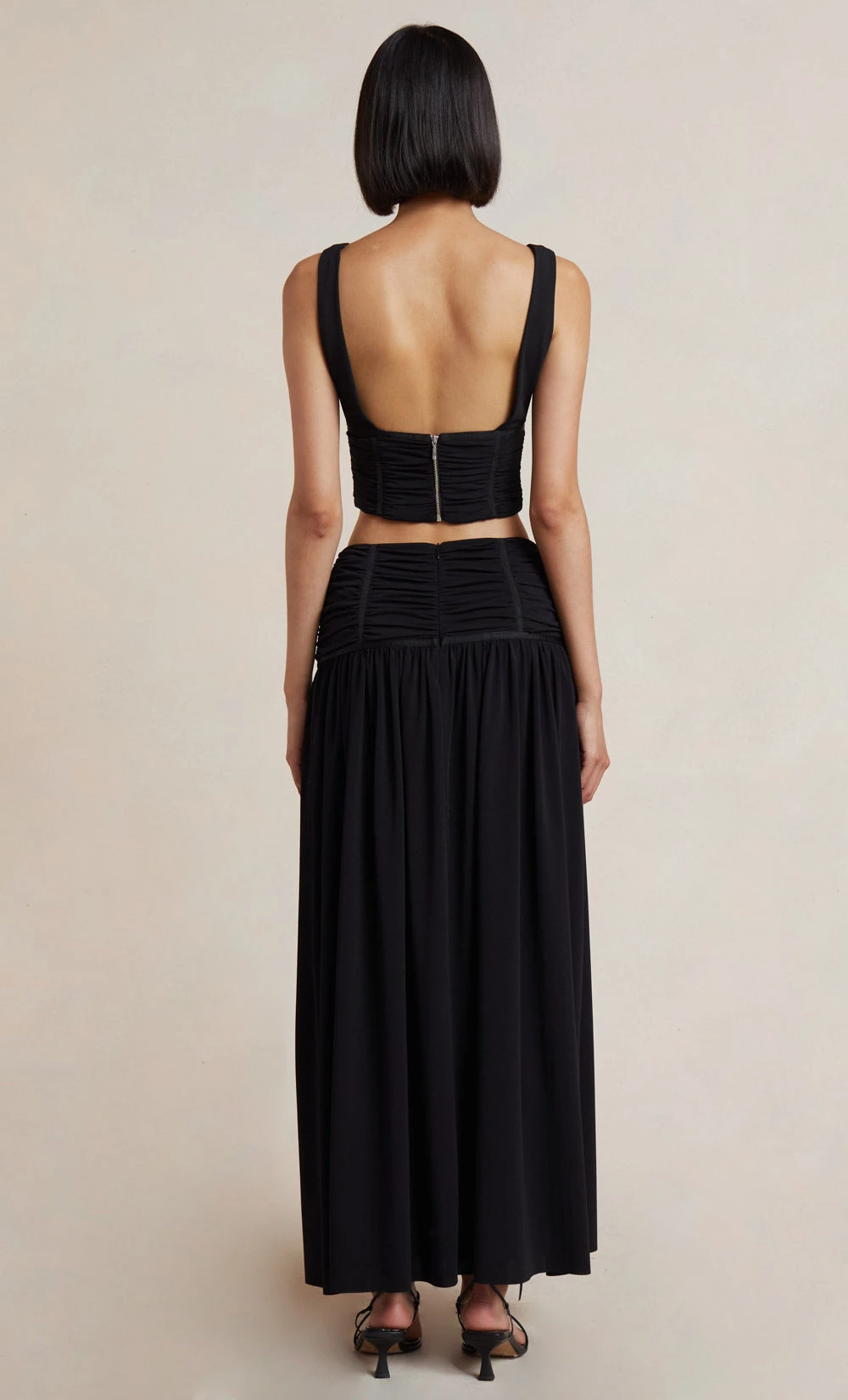 The Gwen Skirt is cut from a fluid crepe fabric and designed to be fitted at the high waist. This eventwear style features a gathered drop waist paneling that flows into a maxi length, finished with a front side split leg. Styled with our matching Gwen Top.