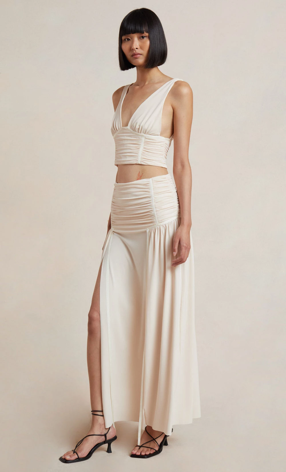 The Gwen Top is cut from a fluid crepe fabric in a fitted cropped silhouette. This eventwear style features a gathered bust with a plunging neckline with a gathered ruched panel hem. Styled with our matching Gwen Maxi Skirt.