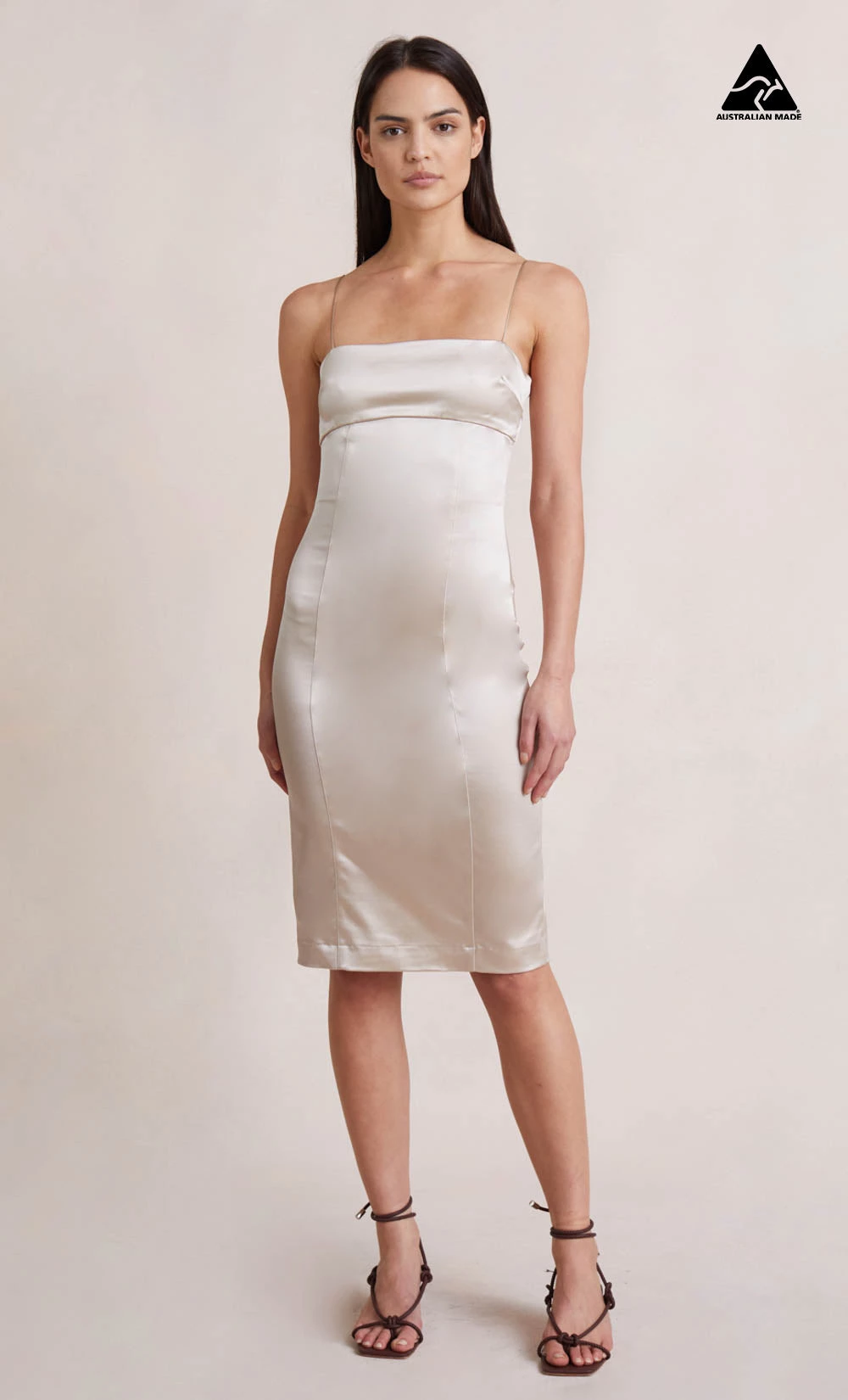 The Heather Midi Dress is a chic eventwear style cut from a lustrous satin fabric. The dress accentuates and skims along the figure, finished with a straight neckline and thin rouleau straps that lead to a cutout back.