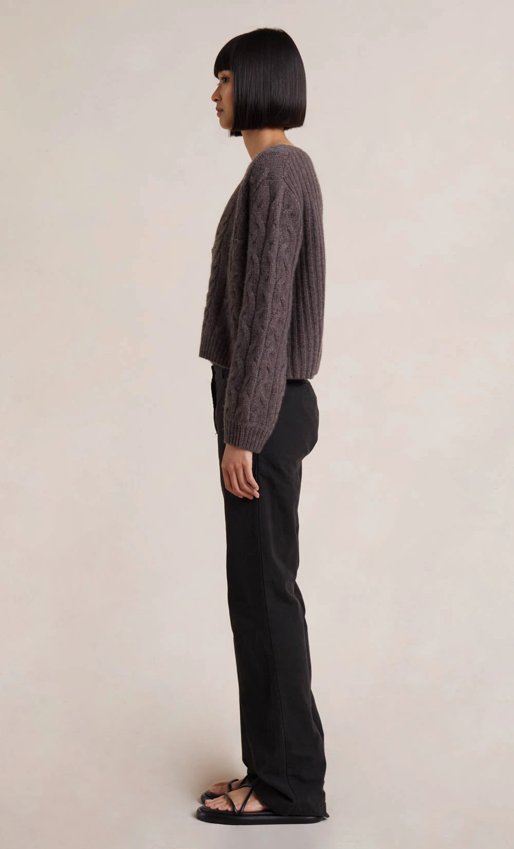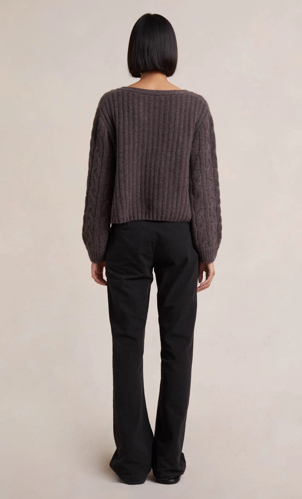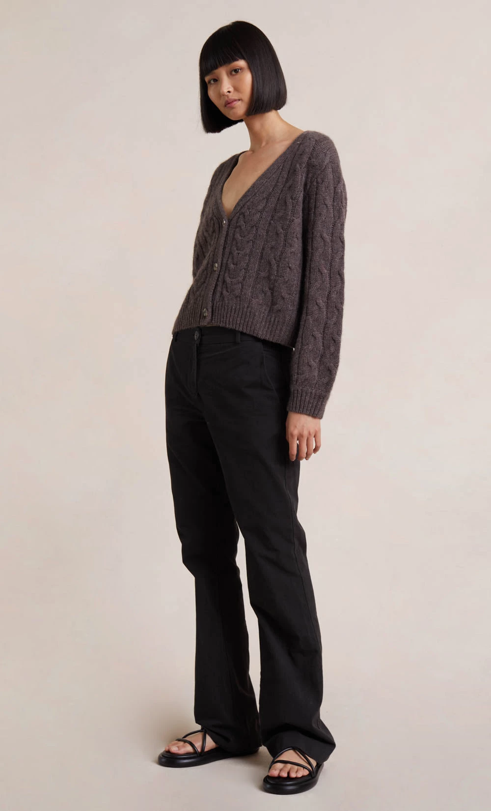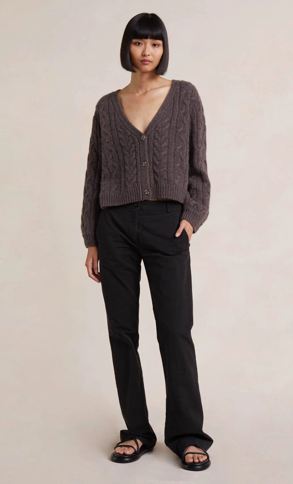 Spun from a soft cashmere blend, the Iris Knit Cardigan is a timeless classic. The flattering cable knit cardigan is cut in a slightly cropped silhouette and features a plunge V-neckline, and ribbed sleeve cuff and hem. Styled with our Lee Pant.