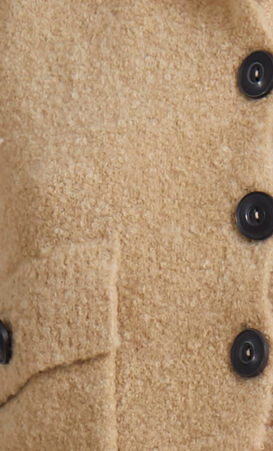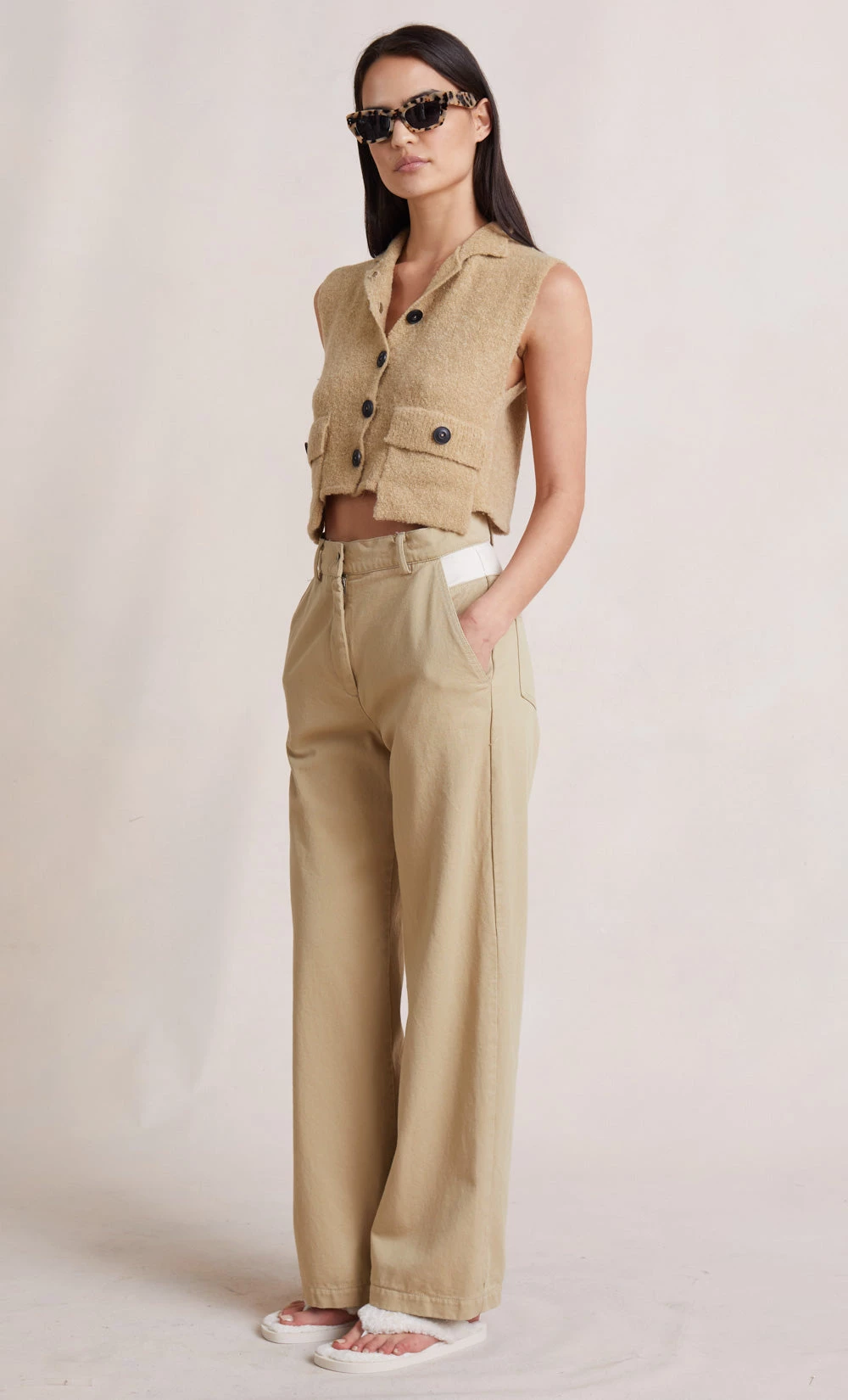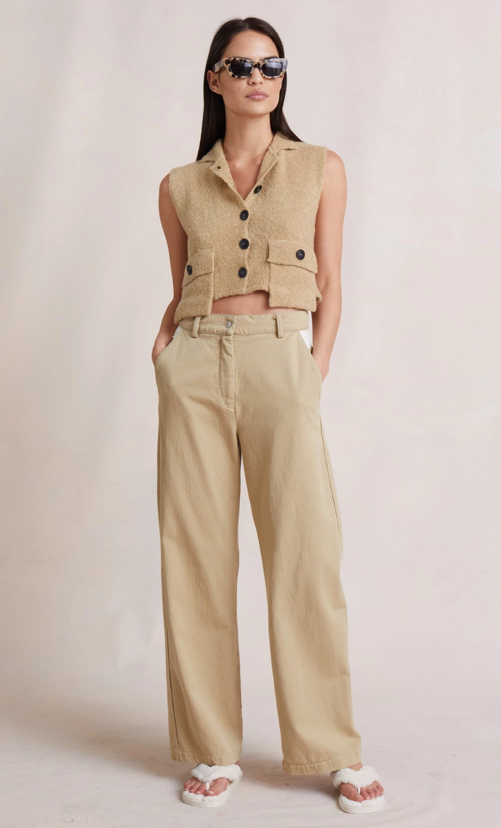 As worn by Kendall Jenner, the Jael Knit Top is a sleeveless woven boucle knit vest with contrasting black buttons. The knit top is a cropped fit style with oversized patch pockets and a relaxed collar. The top can be styled on its own or layered over a thin knit for additional coverage in the cooler months.