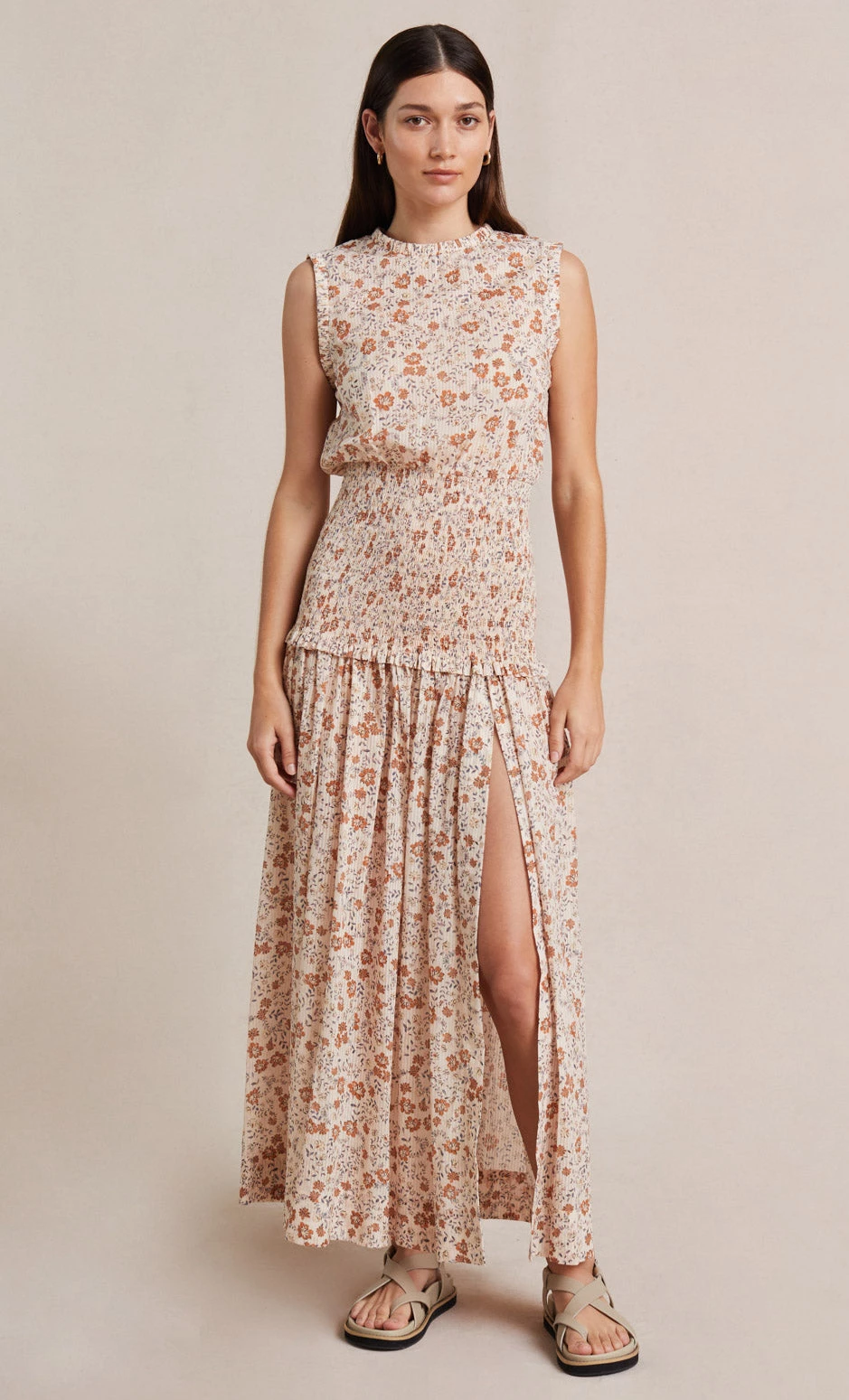 The Janice Midi Dress is an easy-to-wear style cut from our signature floral print fabric. The midi dress is designed in a relaxed silhouette on the bust and skirt and a more form-fitting shirred detail on the hips and waist. Complete with a high neckline with a feminine frill trim and a full skirt with a front split leg.