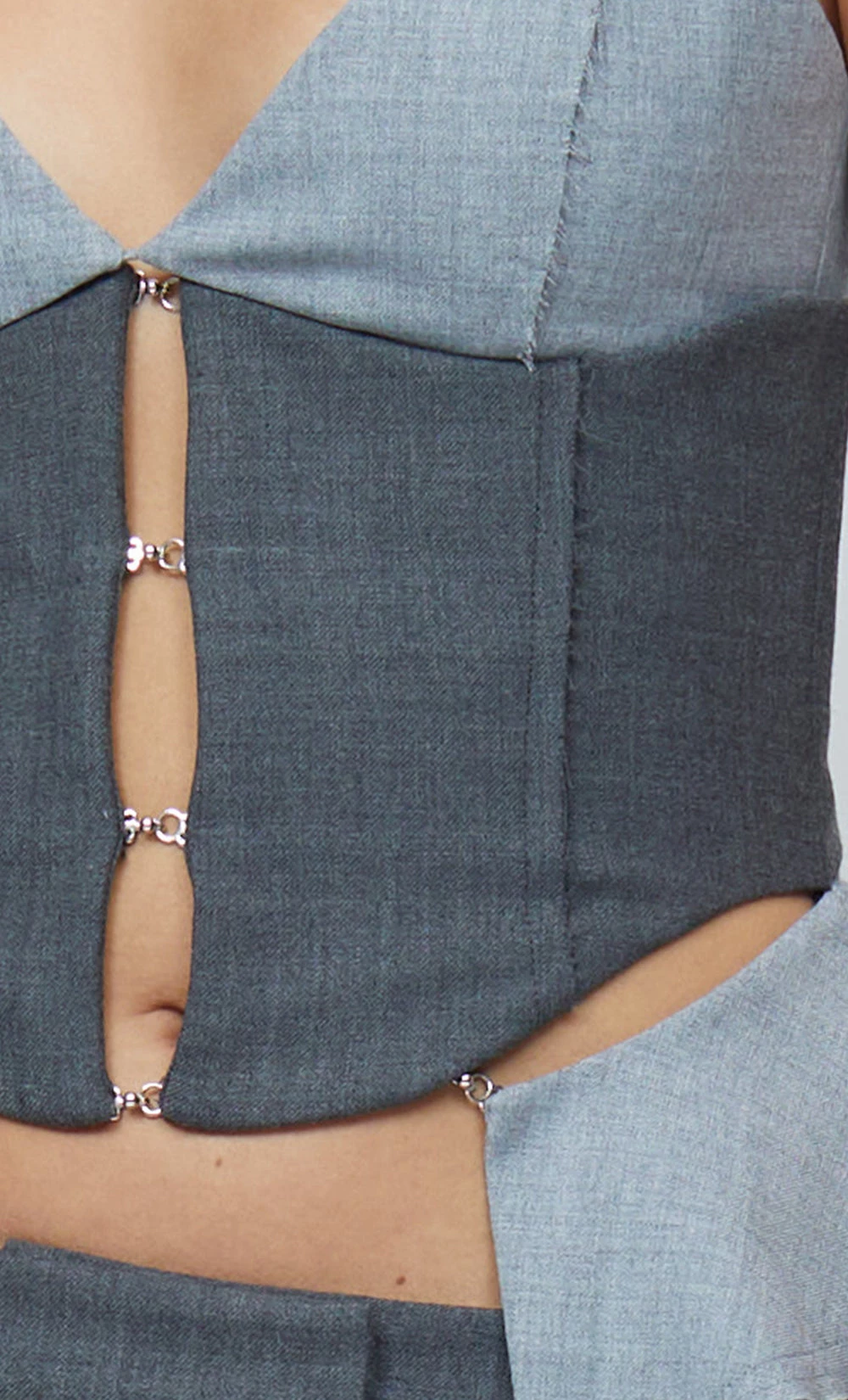 The chic Janice Peplum Top is cut for a firm and flattering fit. The corset style bodice features a v-neck, adjustable thin straps and is complimented by contrast fabric, raw edging and silver e-hook hardware detailing.