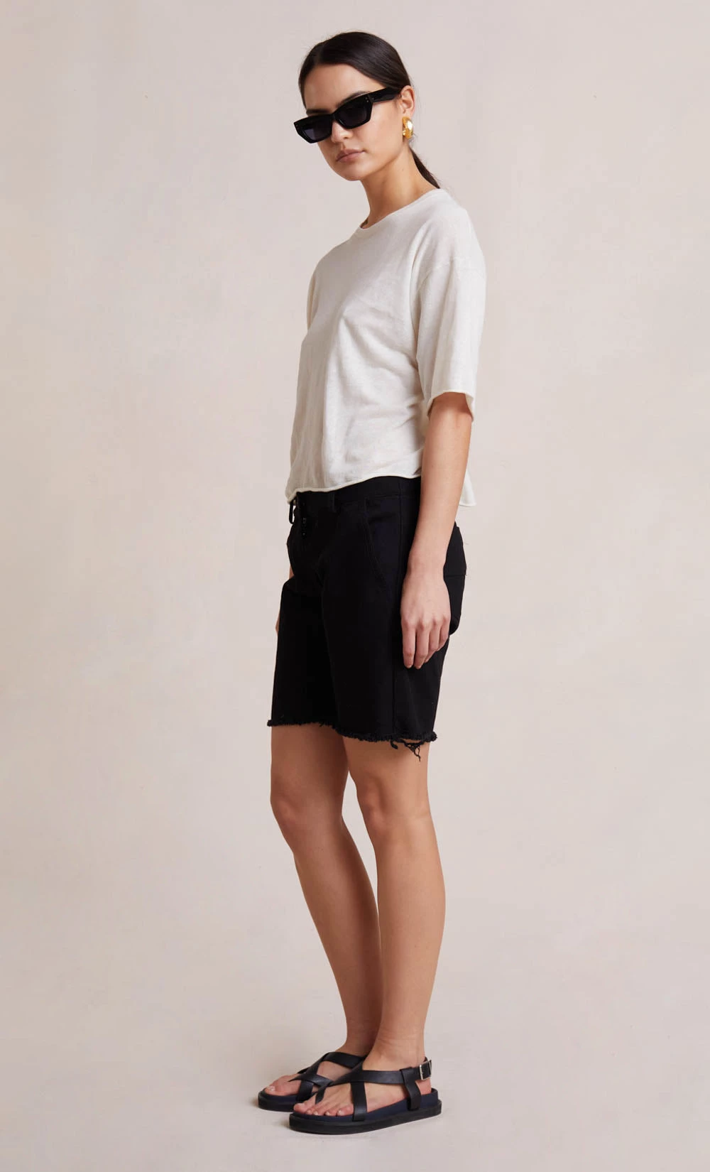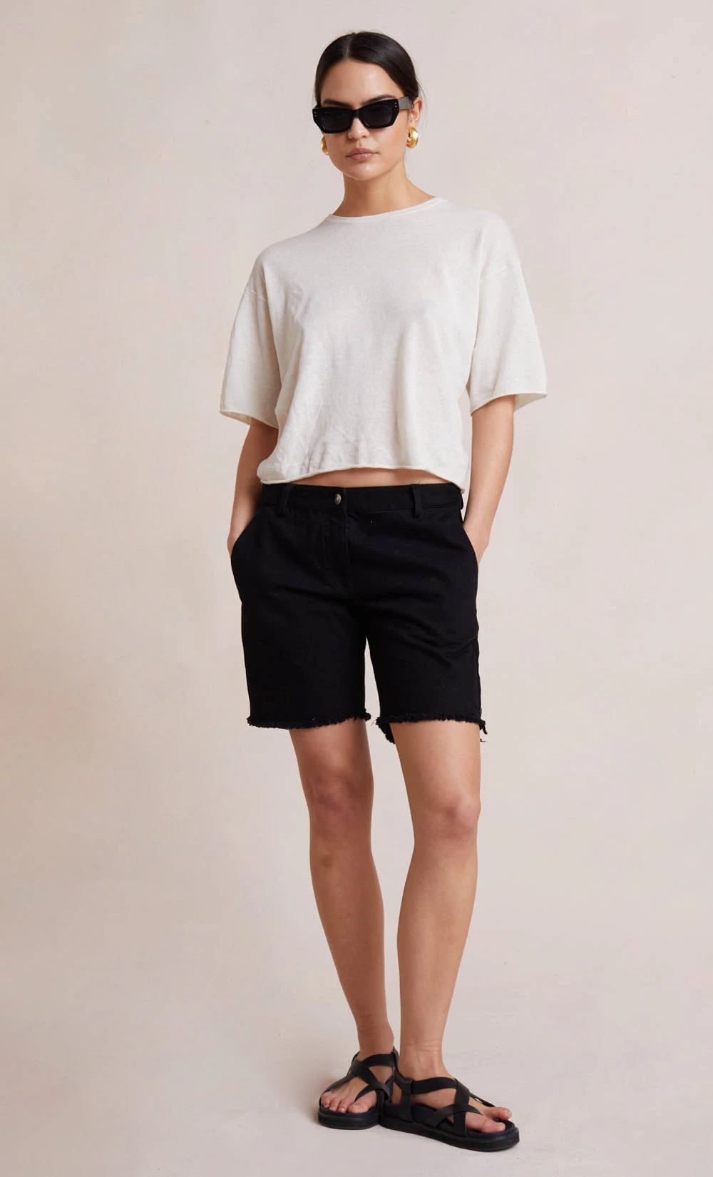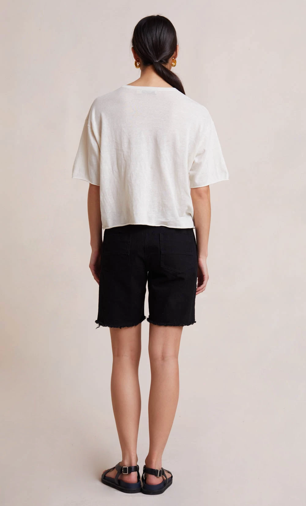 An effortless and easy-to-wear style, the Jimi Knit Tee is spun from a lightweight knit fabric. Designed in a classic fit, the tee features a crew neckline with rolled elbow sleeves and a cropped hem. Styled with our Erika Drill Shorts.
