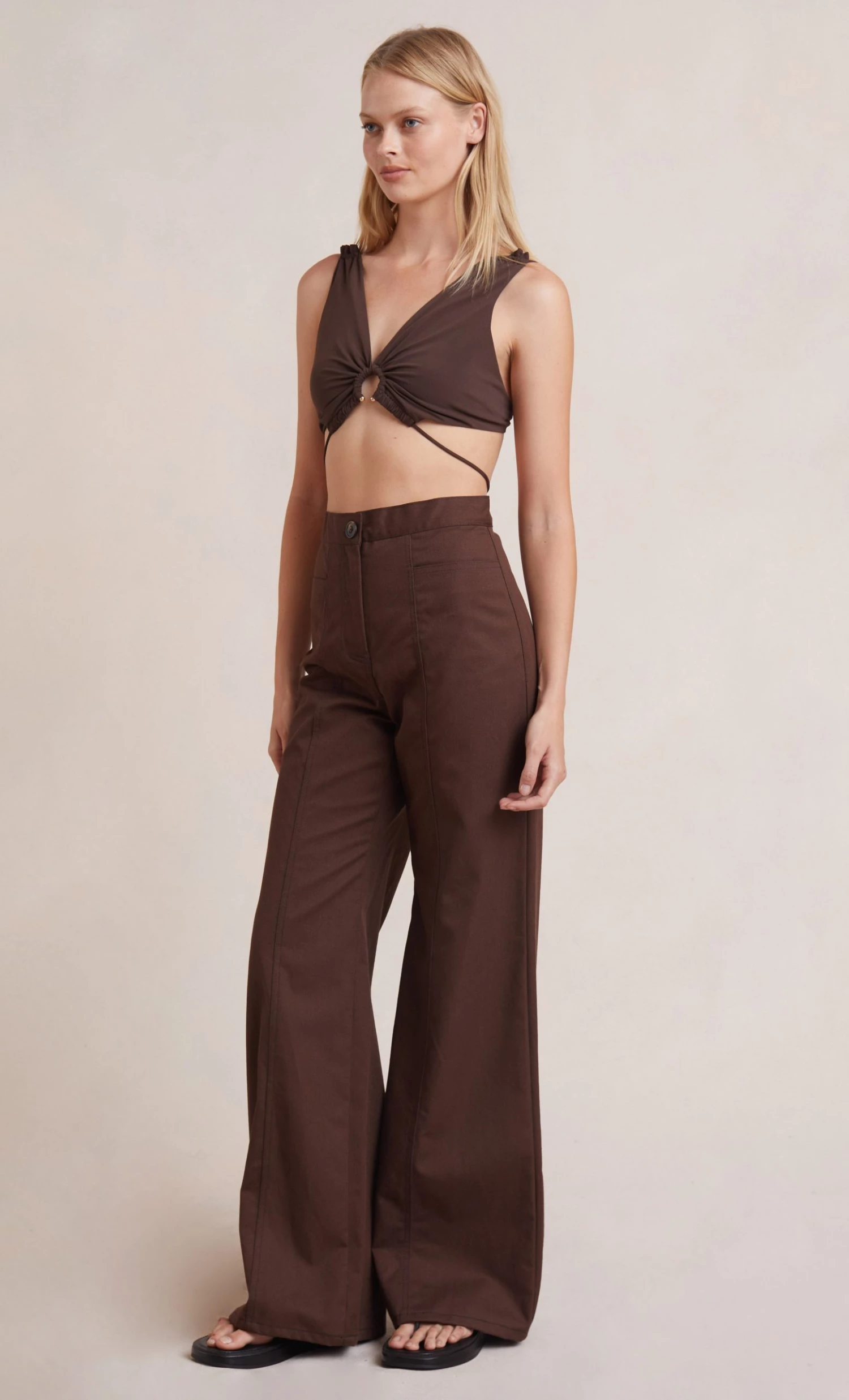 The Joelene V Crop Top is a statement bralette style top with a V-neckline and silver U-ring hardware detail accented at the bust and self-ties that lead to an open back. Styled with our Axel Pant.