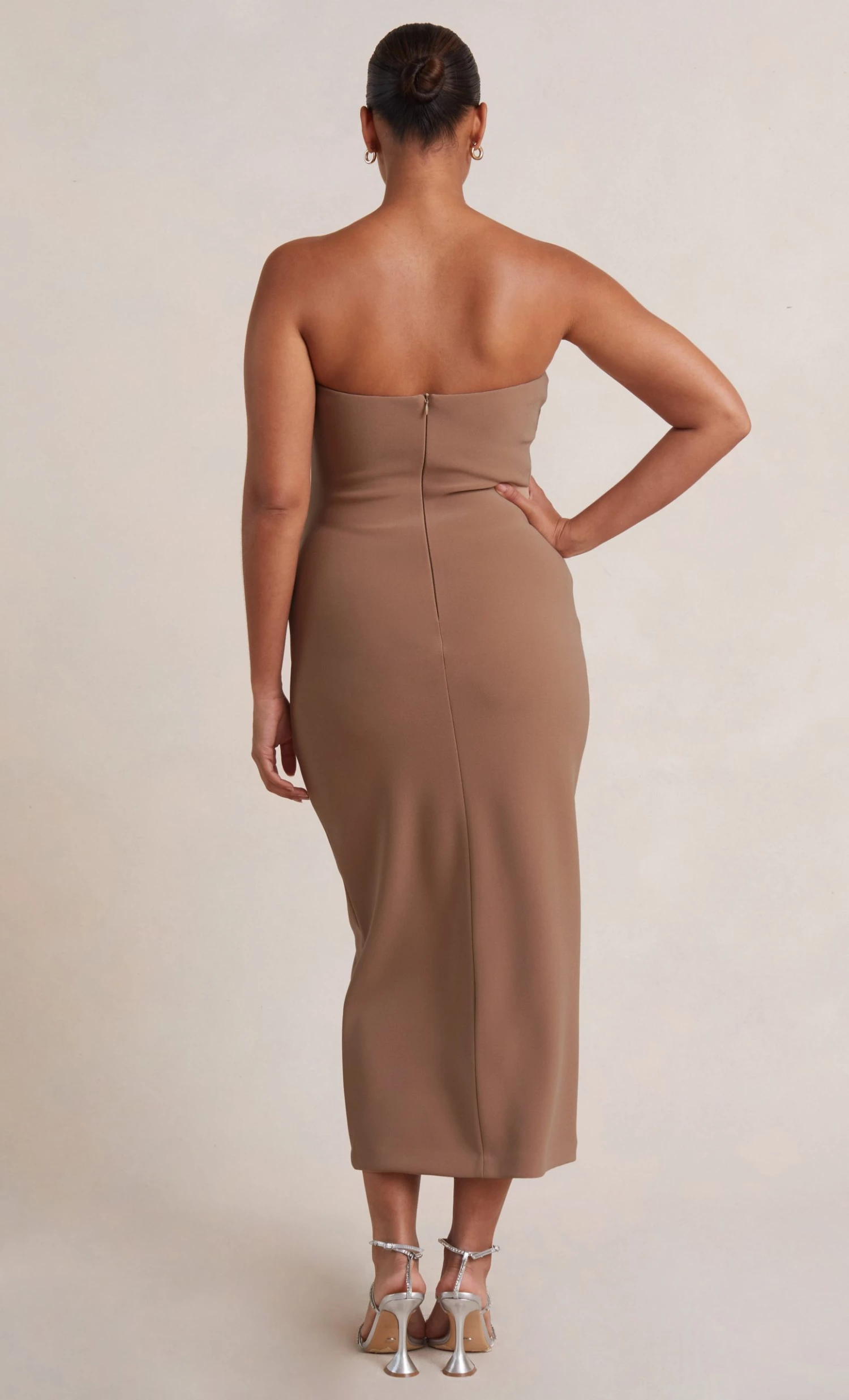Our effortless Karina Strapless Midi Dress is cut from a stretch bonded crepe fabric that cinches in the body and skims the silhouette. The Midi features side tuck detailing at the waist and hips for a comfortable and flattering fit.