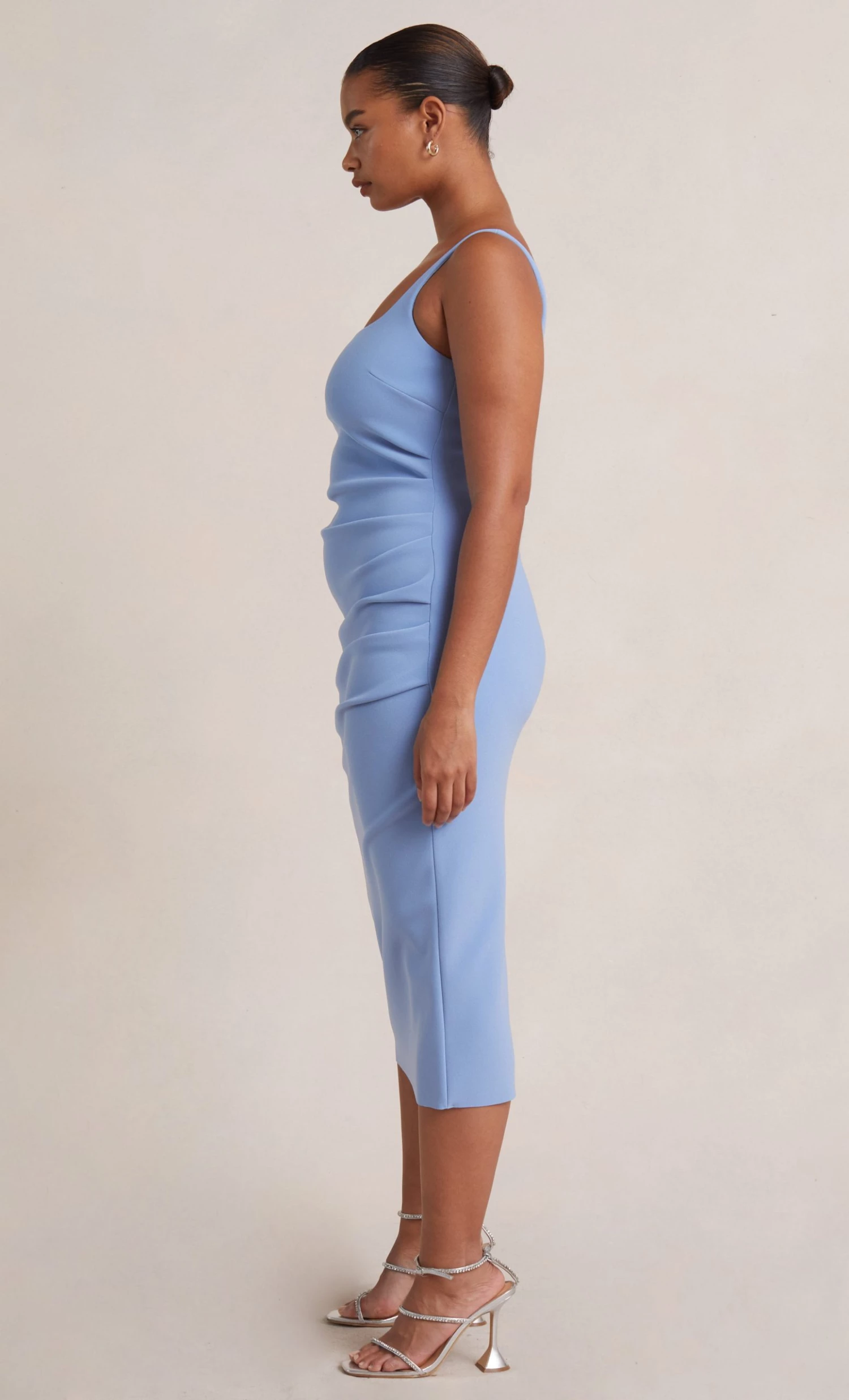 A timeless square neck midi dress with a low scoop back. The stretch bonded crepe fabric and side tuck detailing at the waist and hips of the dress create a very easy to wear and flattering silhouette for all body types.